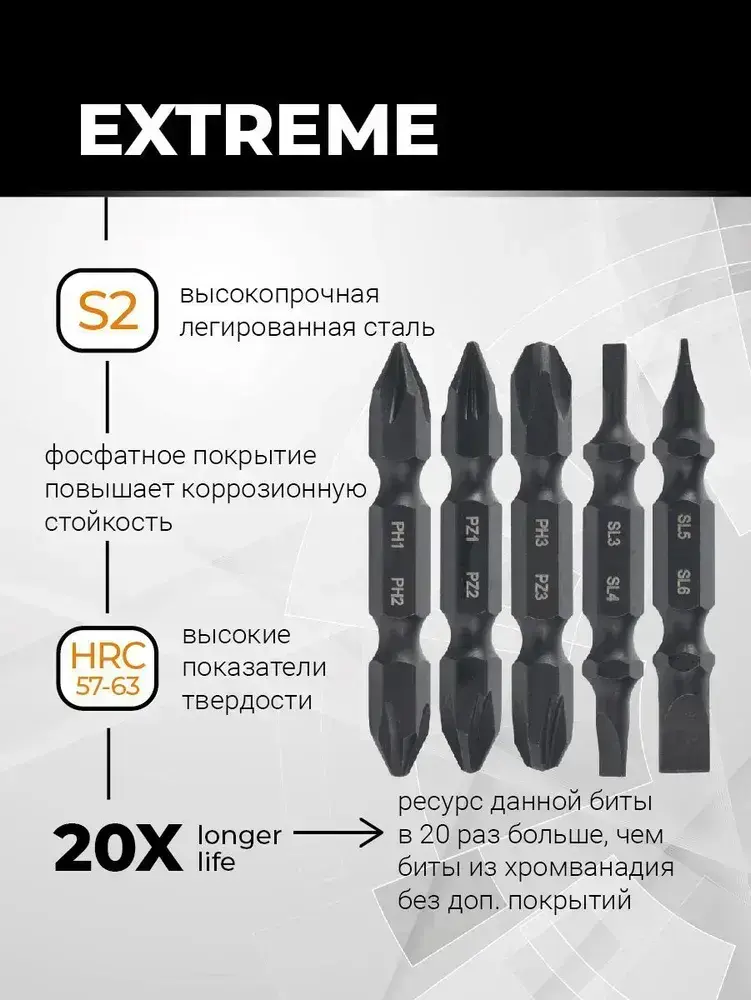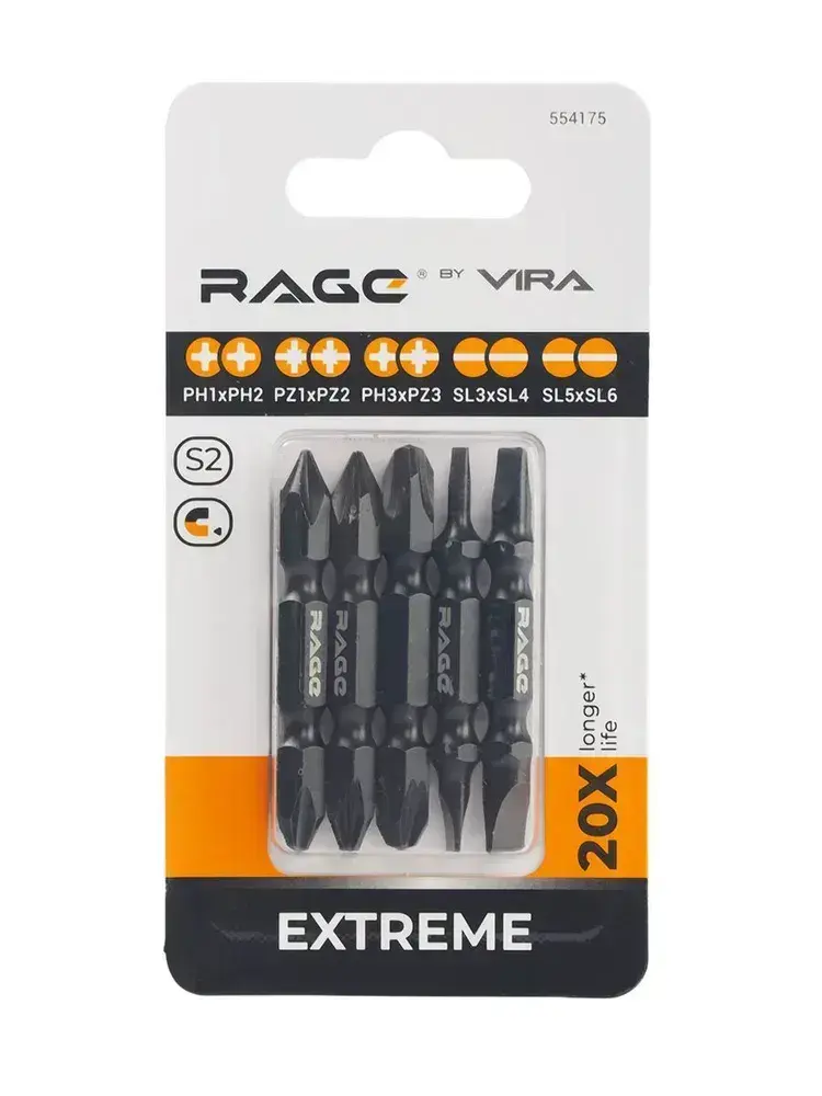 Набор бит двухсторонних 5 шт S2 PH1 x PH2 PZ1 x PZ2 PH3 x PZ3 Sl3 x Sl4 Sl5 x Sl6 50 мм RAGE by VIRA