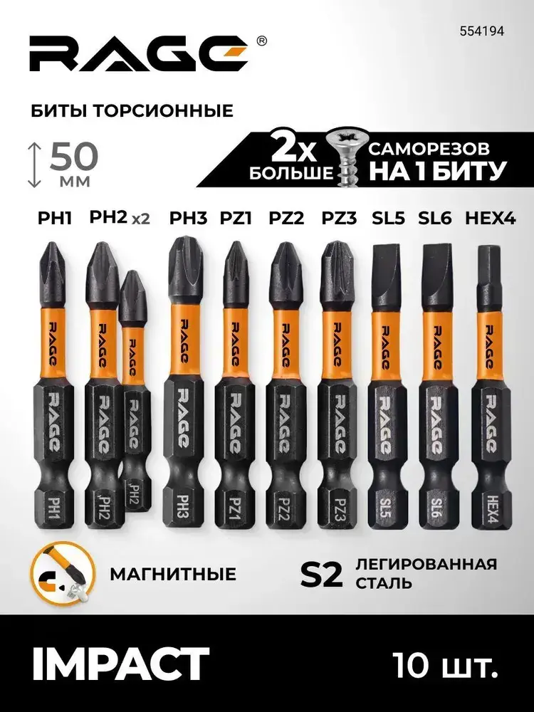 Набор бит торсионных IMPACT S2 PH PZ SL HEX x 50 мм 10 шт RAGE by VIRA