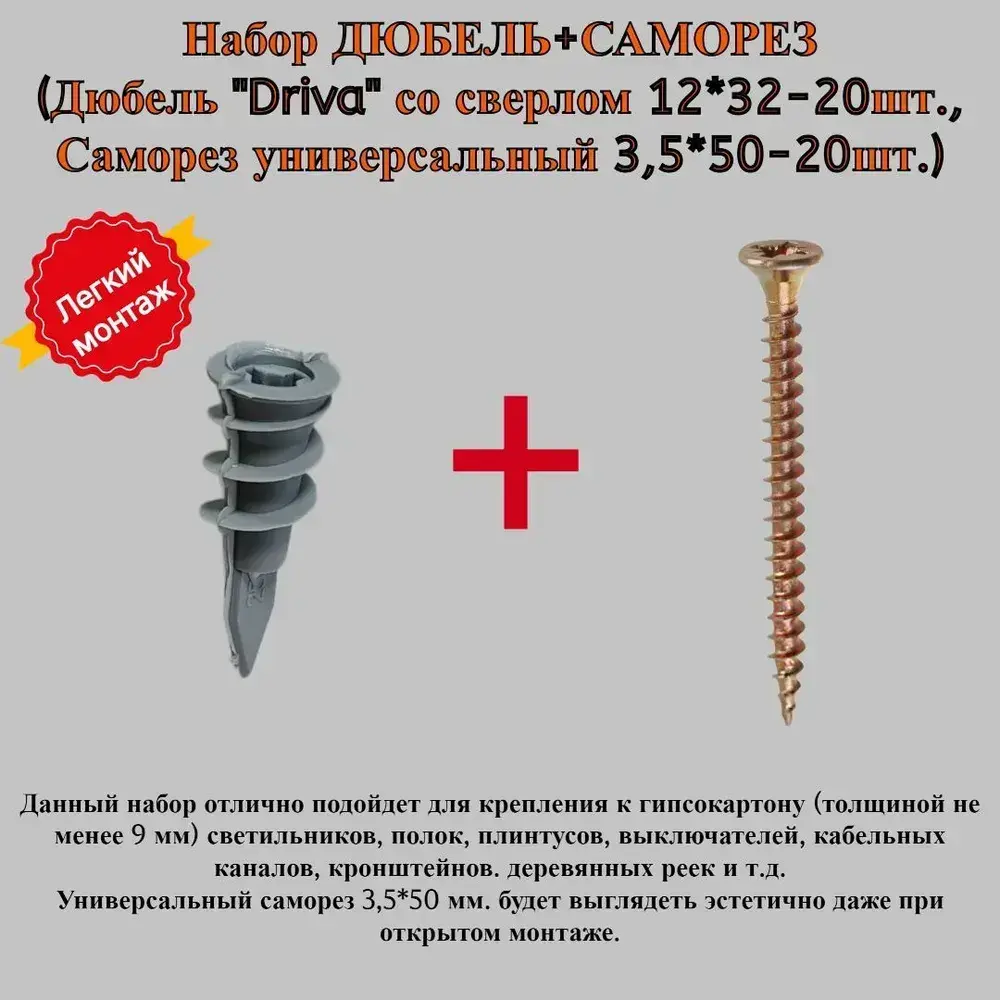 Набор ДЮБЕЛЬ+САМОРЕЗ (Дюбель "Driva" 12*32 со сверлом-20шт., Саморез универсальный 3,5*50-20шт.)