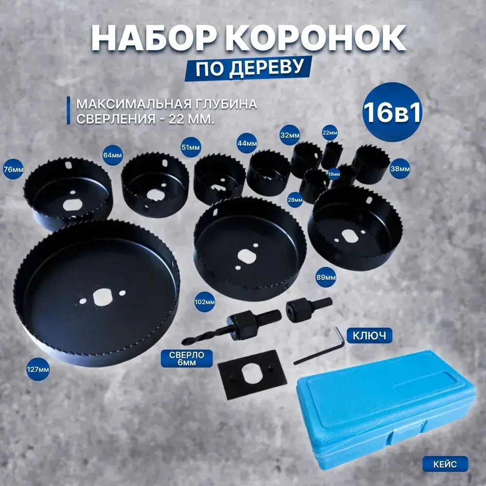Набор кольцевых пил (коронок) по дереву X-PERT в синем кейсе 16 предметов