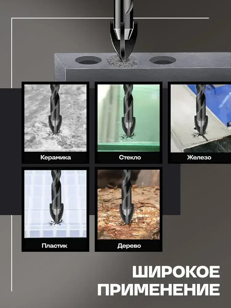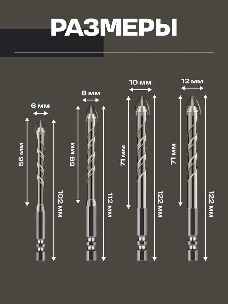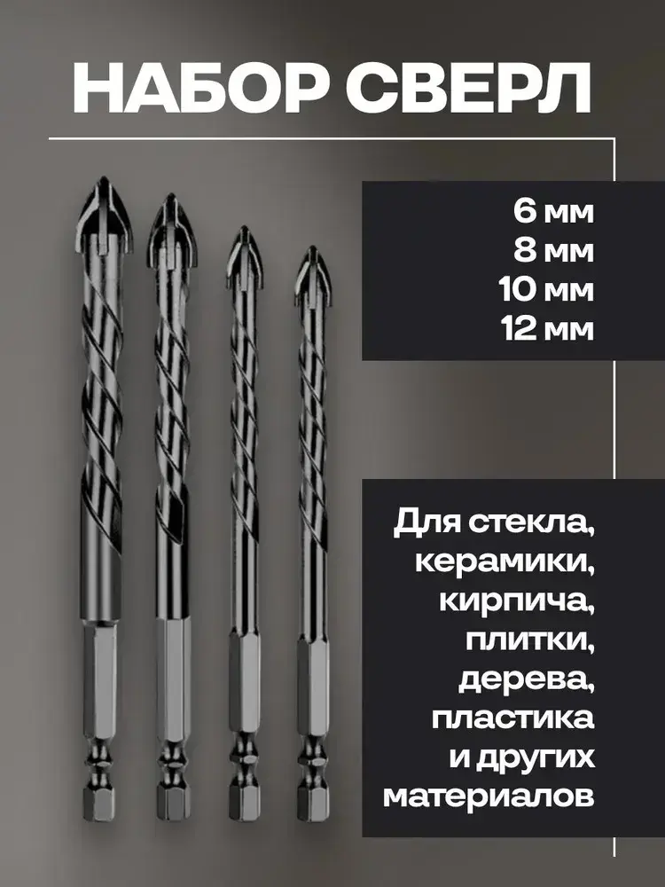 Набор направляемых сверл по стеклу, керамике и кафелю копьевидные 6, 8, 10, 12 мм с шестигранным хвостовиком (4 предмета)