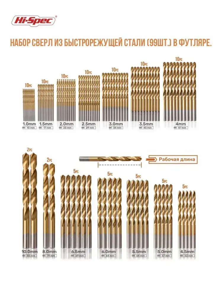 Набор сверл HSS с титановым покрытием 1-10мм в кейсе 99 штук