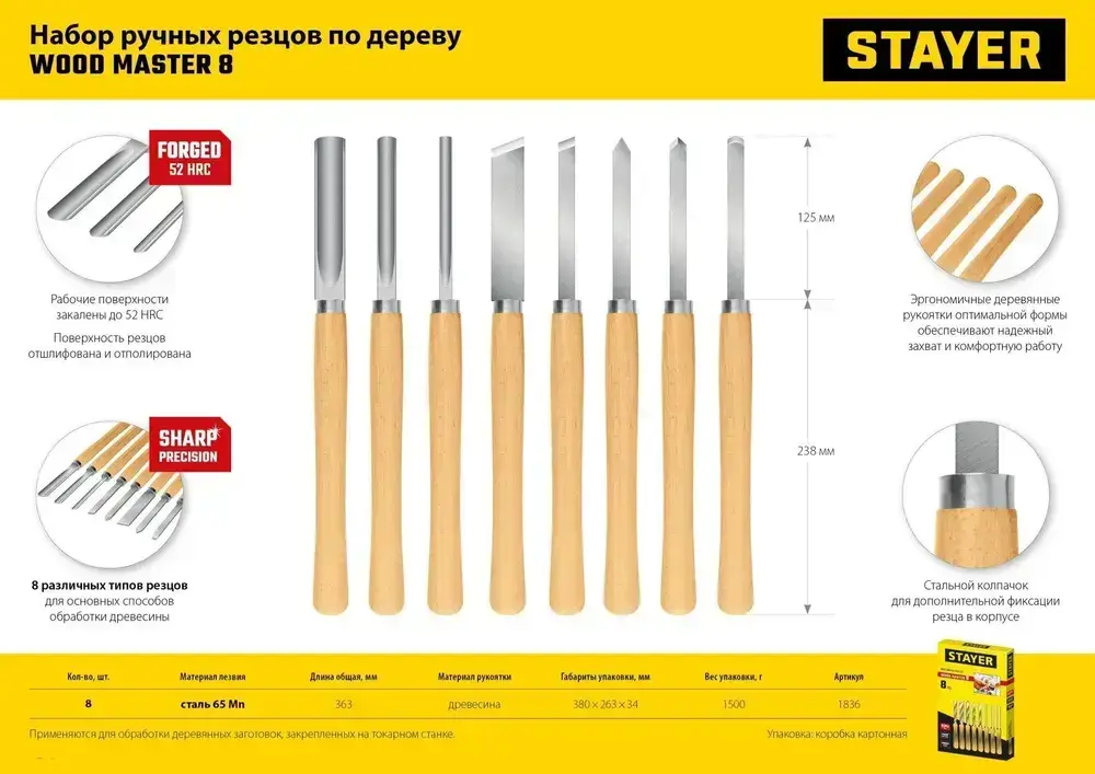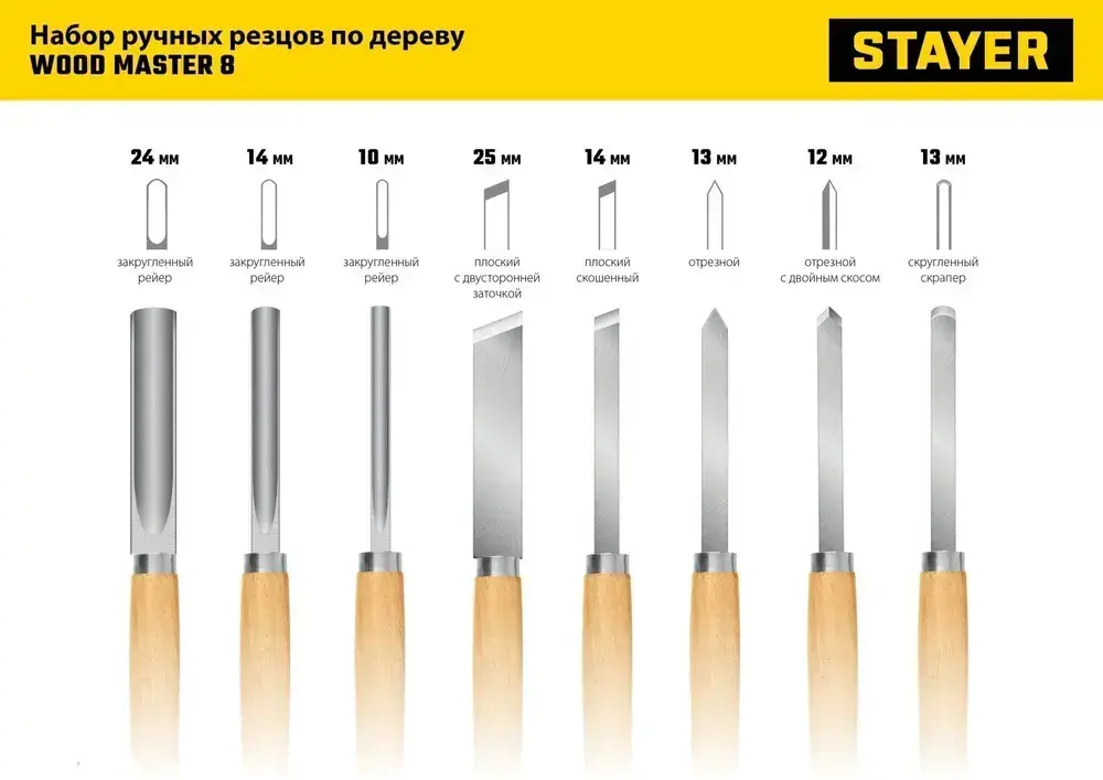 Набор токарных резцов по дереву, STAYER 8 шт.