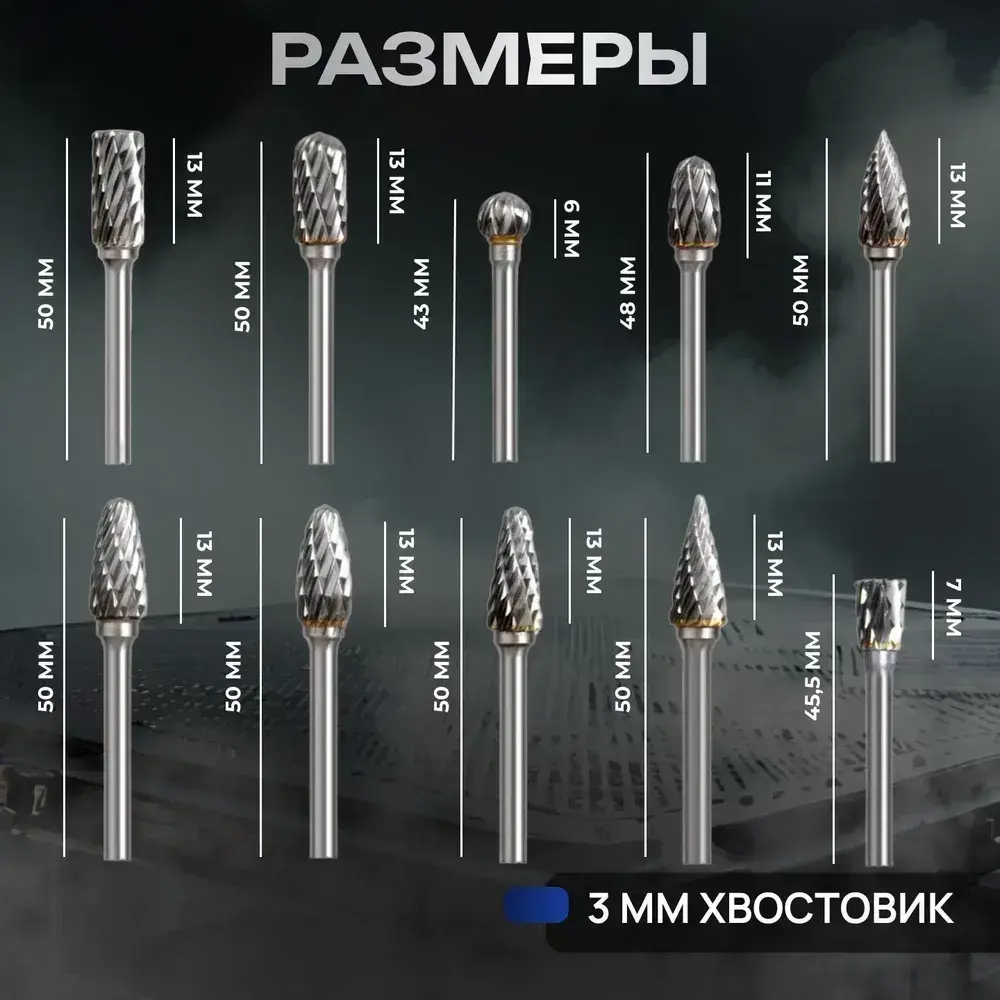 Набор твердосплавных борфрез 10 штук, шарошка по металлу, фреза по металлу для дрели