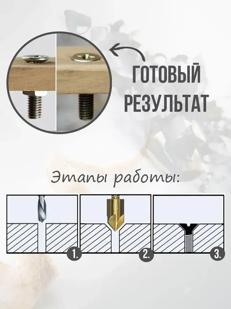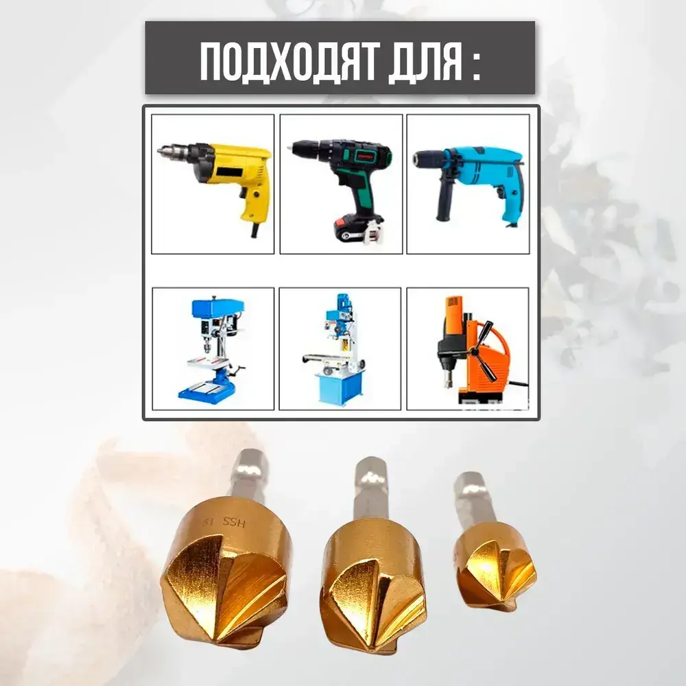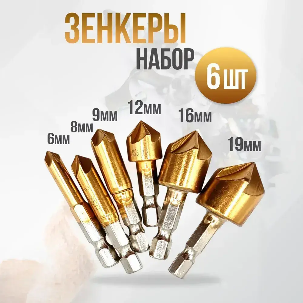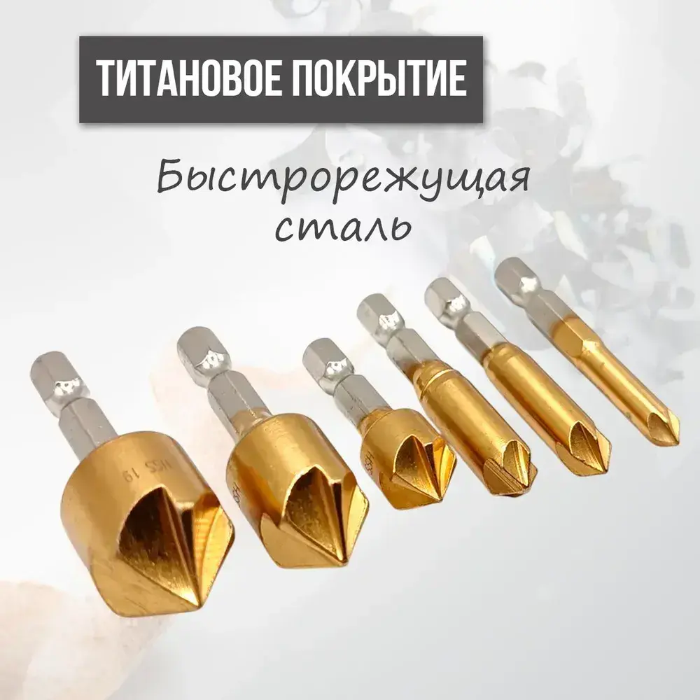 Набор зенкеров по металлу и дереву 6, 8, 9, 12, 16 и 19мм с титановым покрытием, в наборе 6шт
