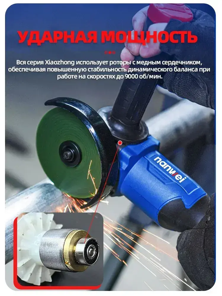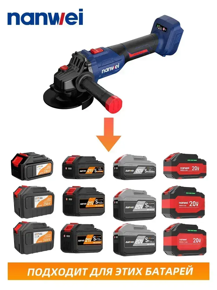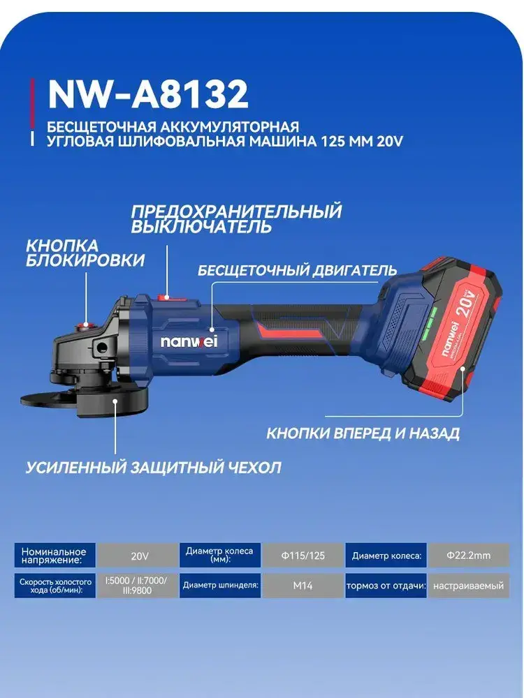 NANWEI 125 мм Угловая шлифовальная машина 5000/7000/9800 об/мин, 20 В, бесщеточный двигатель (Батарея 6,0ah x 2)