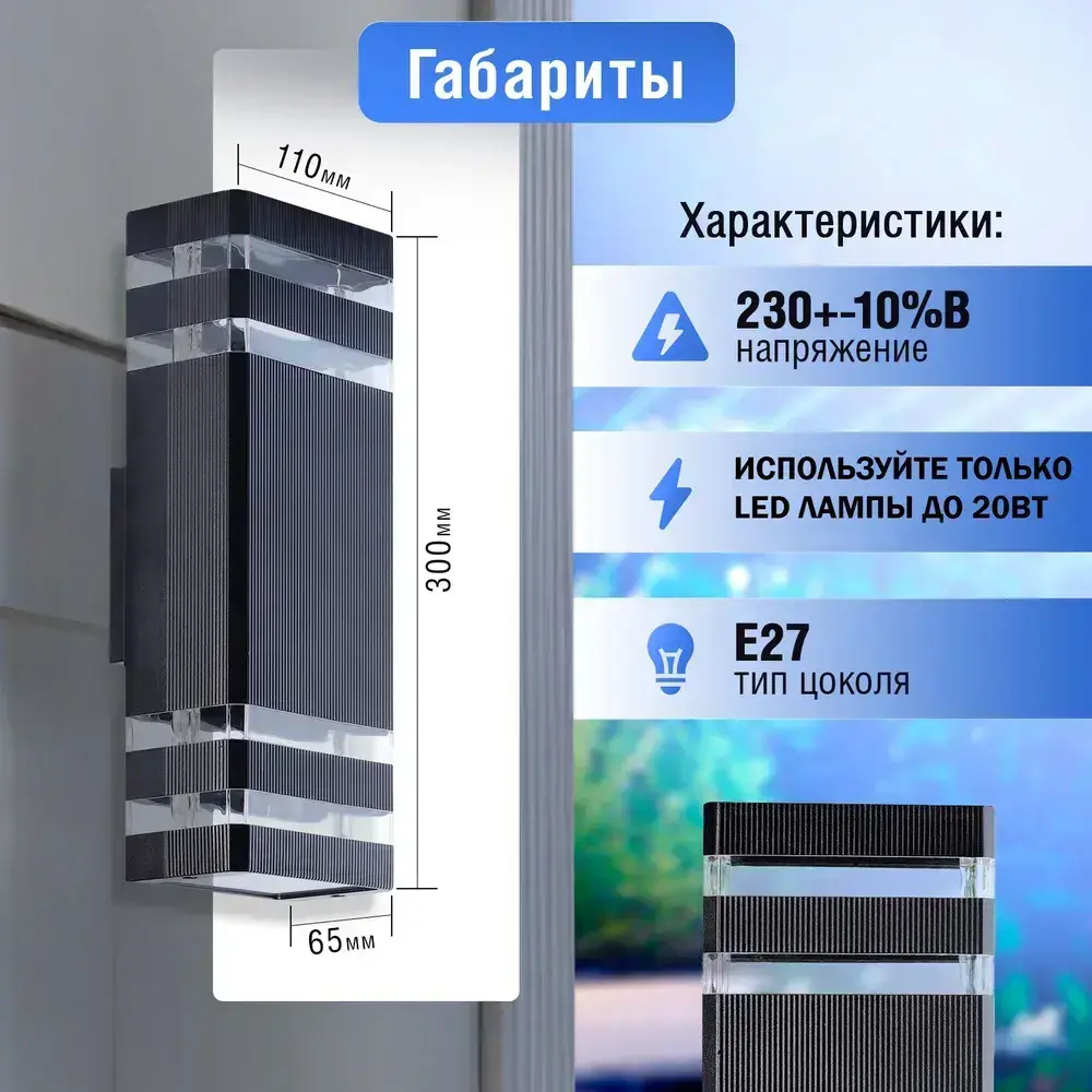 Настенный светильник фасадный уличный двухсторонний 2х60вт под лампу с цоколем Е27. Размер 300х110х65мм. Корпус из Алюминия