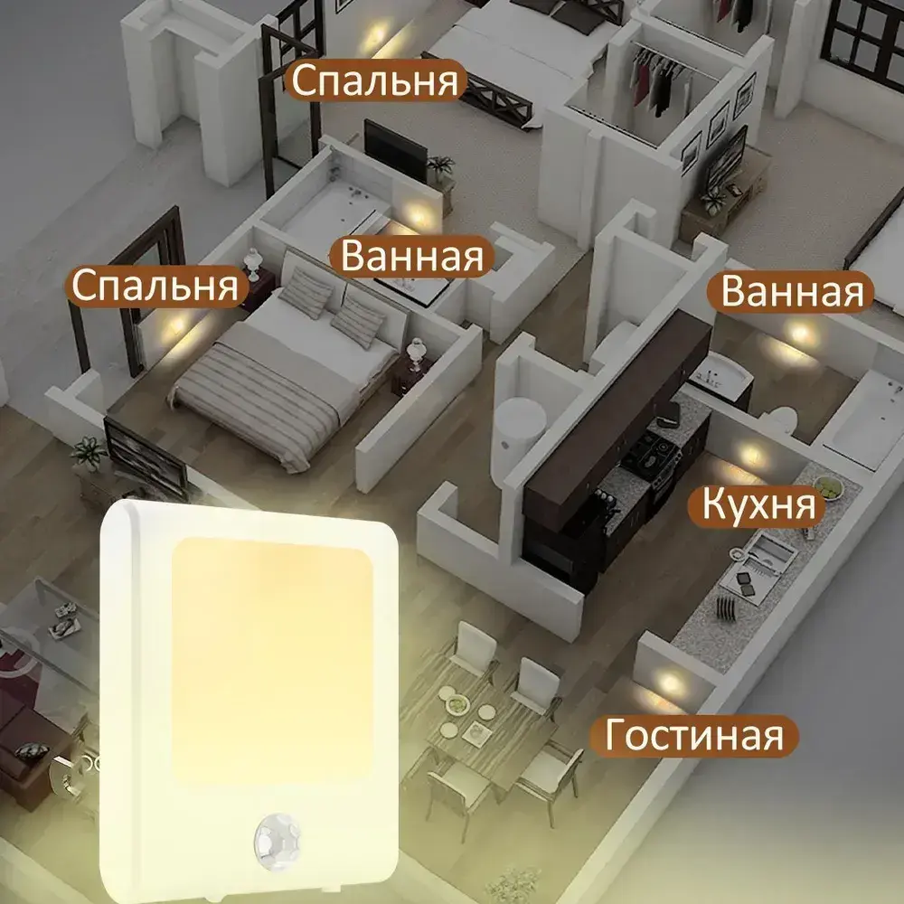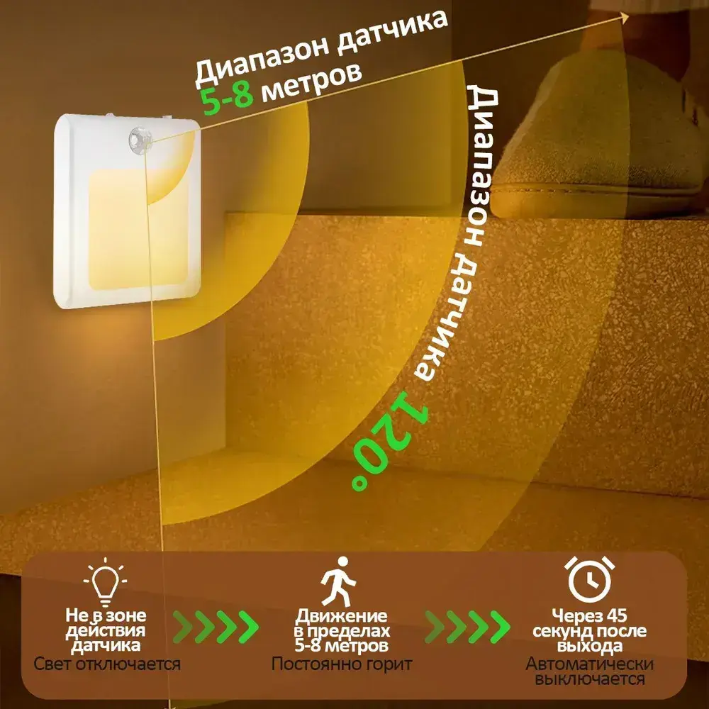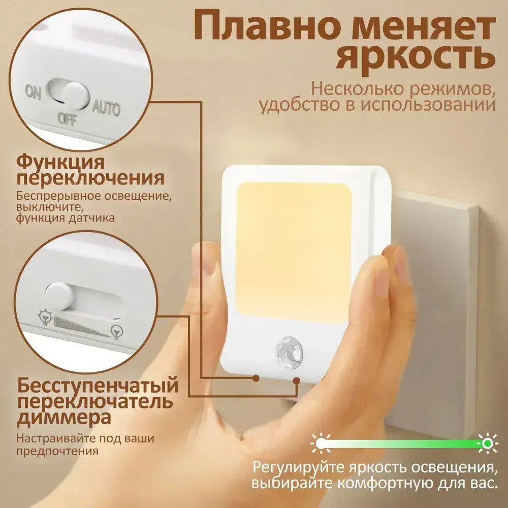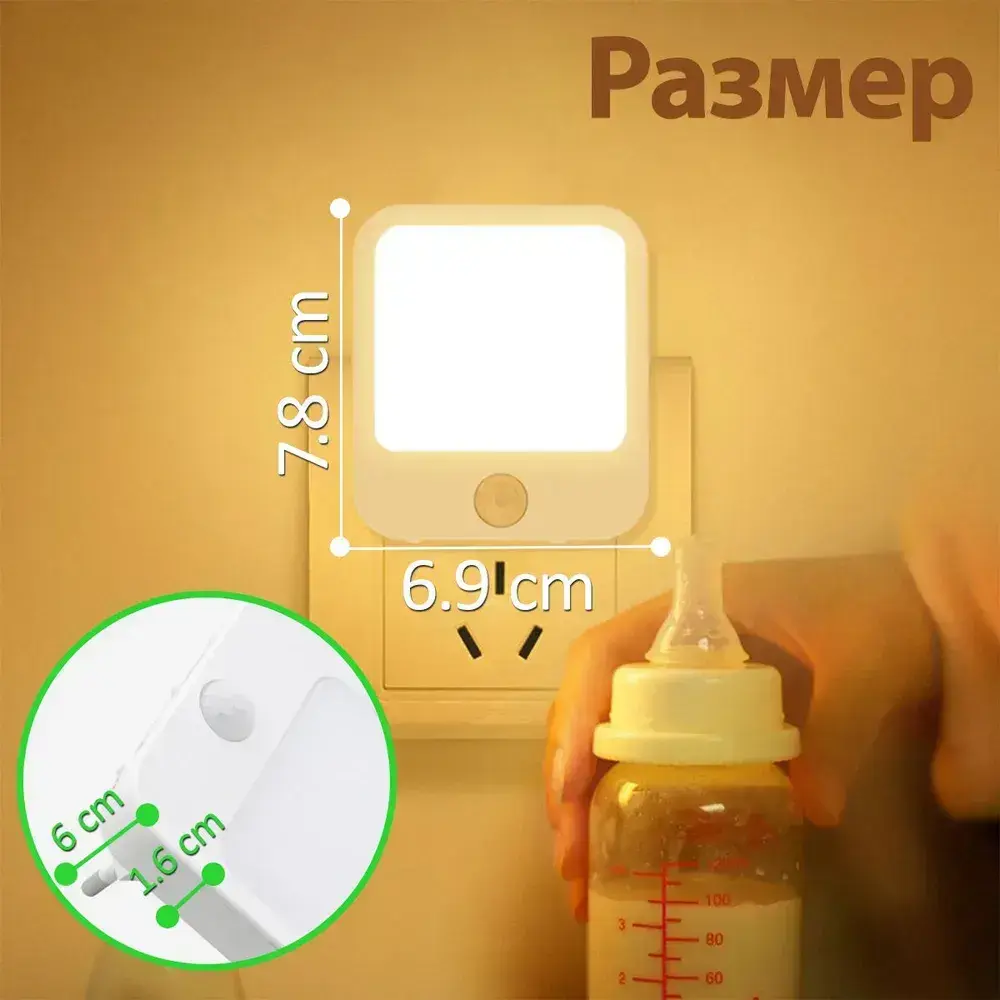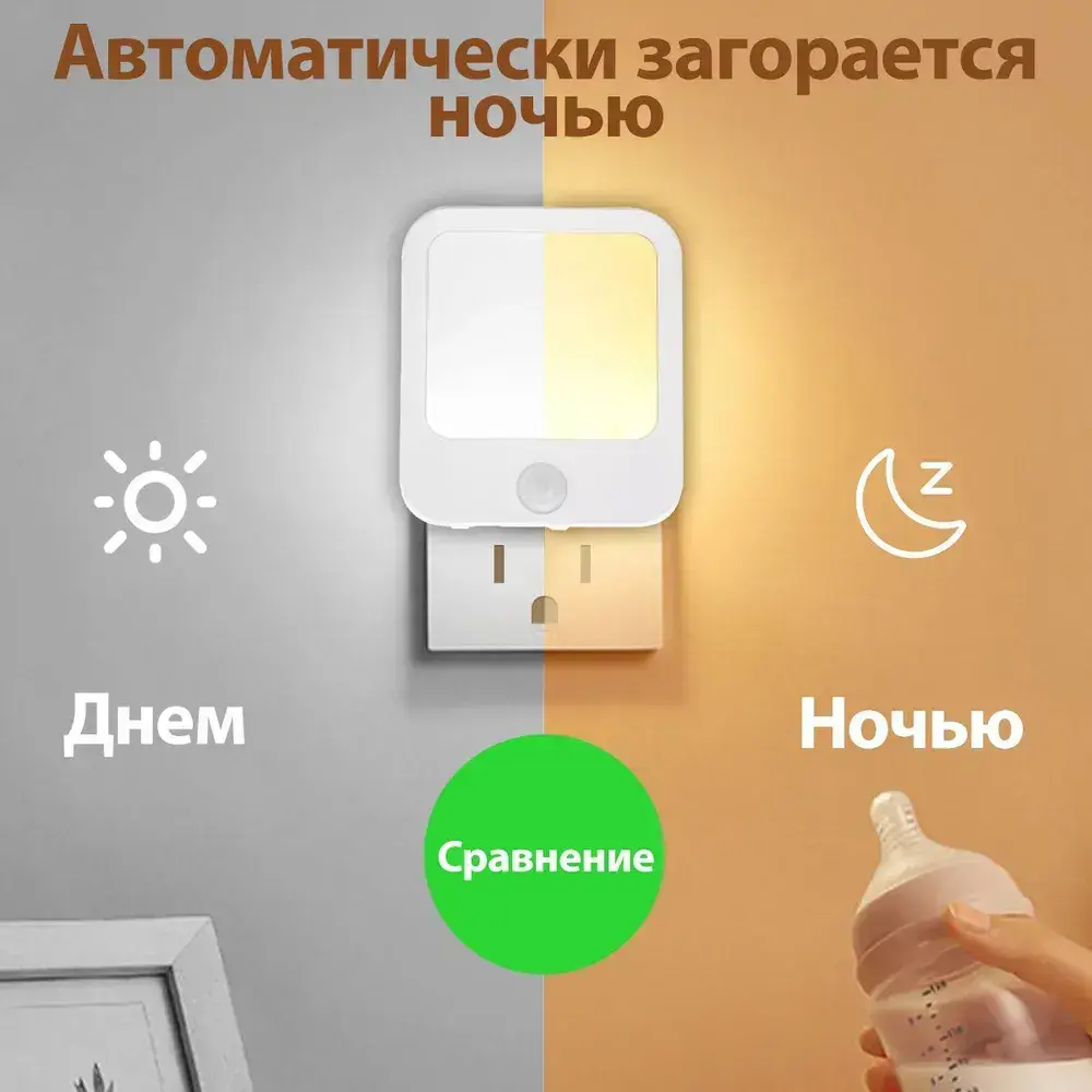 Ночник светодиодный в розетку ,детский ночник, Квадрат с датчиком освещенности,темный свет