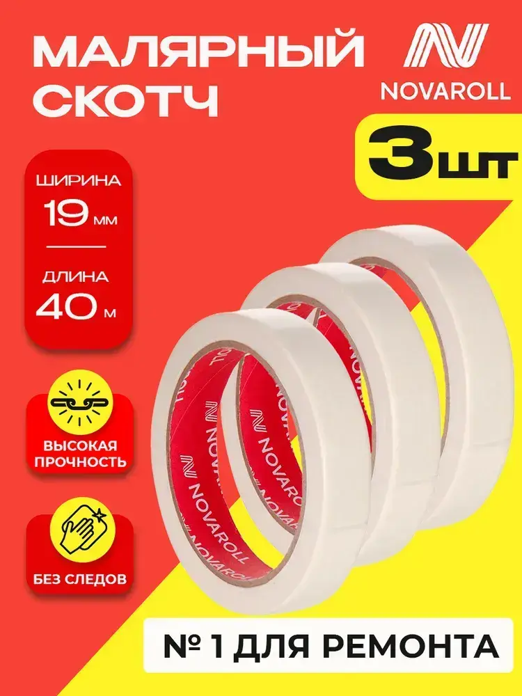 NOVAROLL Малярная лента скотч бумажный узкий 19 мм 40 м набор 3 шт