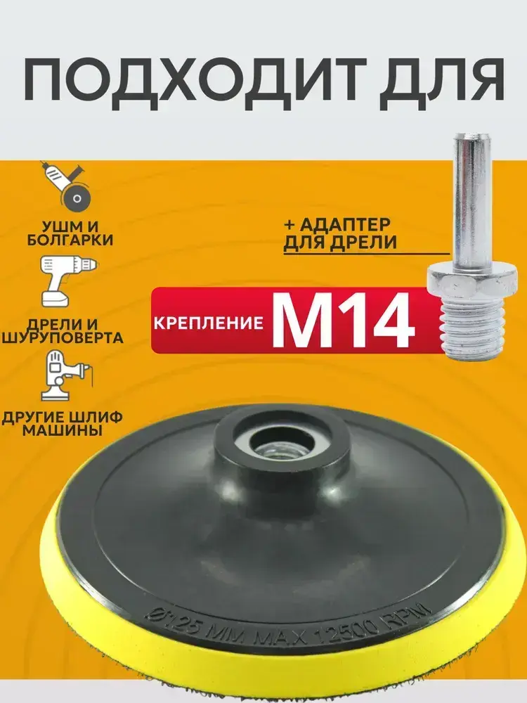 Опорная тарелка насадка для дрели и УШМ с липучкой и адаптером, круг шлифовальный 125