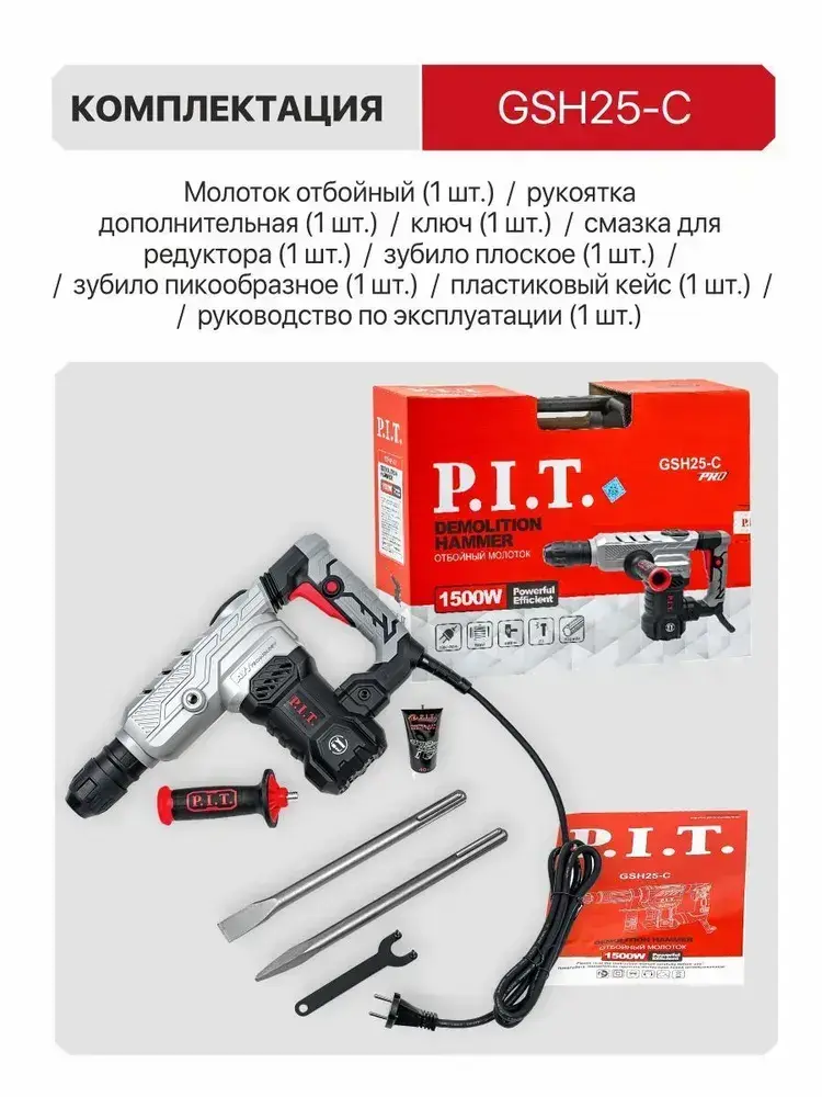 Отбойный молоток электрический P.I.T. GSH25-C в кейсе, 20Дж, 1500Вт, 4100 уд/мин, SDS-MAX, От сети 220В