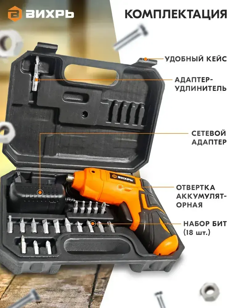 Отвертка аккумуляторная электрическая Вихрь ОА-3,6-К , 250 об/ мин, 18 бит в комплекте, кейс.