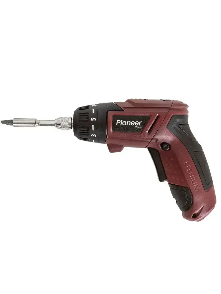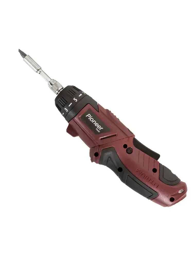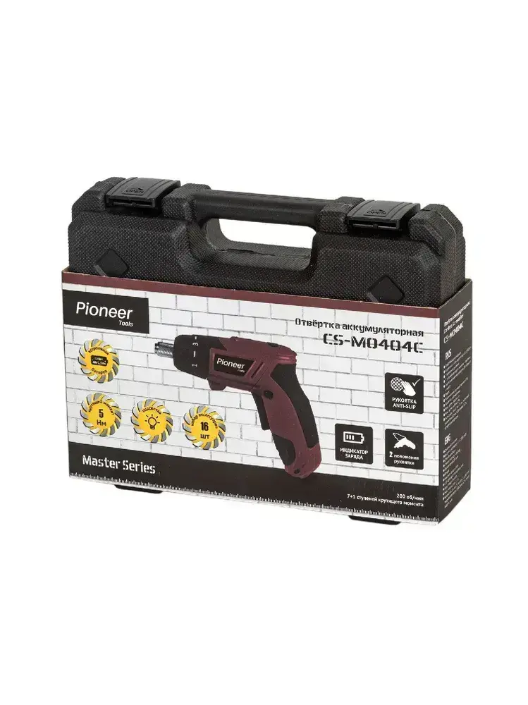 Отвертка аккумуляторная Pioneer CS-M0404C с подсветкой рабочей зоны, 7 ступеней крутящего момента и сверление, 2 положения рукоятки Anti-Slip, 16 бит 25 мм, кейс для хранения