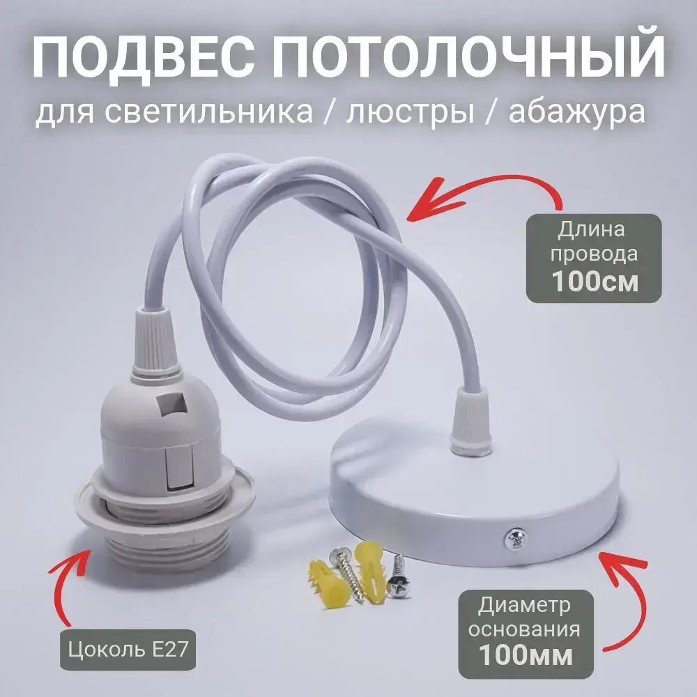 Патрон подвесной Е27 шнур подвес потолочный для светильника и люстры для лампы и абажура декоративный, белый, 60 Вт,1 шт.