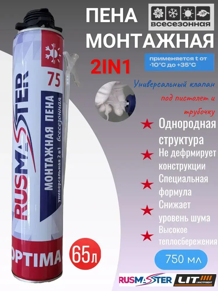 Пена монтажная 2 в1 всесезонная RUS-MASTER OPTIMA 75, 650 гр., до 65 л. 57865