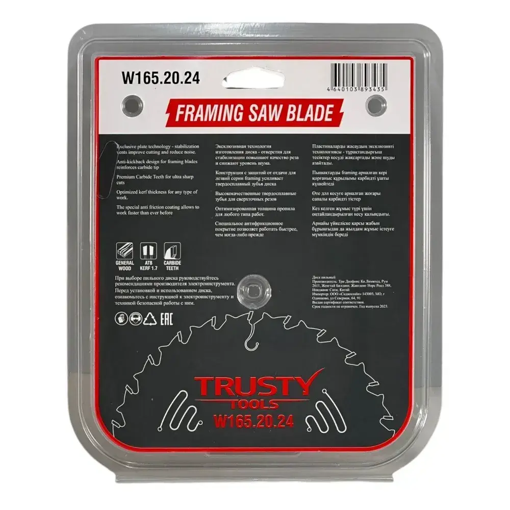 Пильный диск по дереву 165Х20 мм Z24 Trusty-Tools Framing для циркулярной пилы тефлоновое покрытие