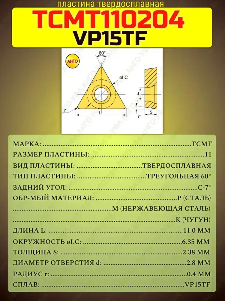 Пластина твердосплавная TCMT110204 VP15TF / 10 штук / сменная Треугольная 60гр. по металлу. ANGO-UFA
