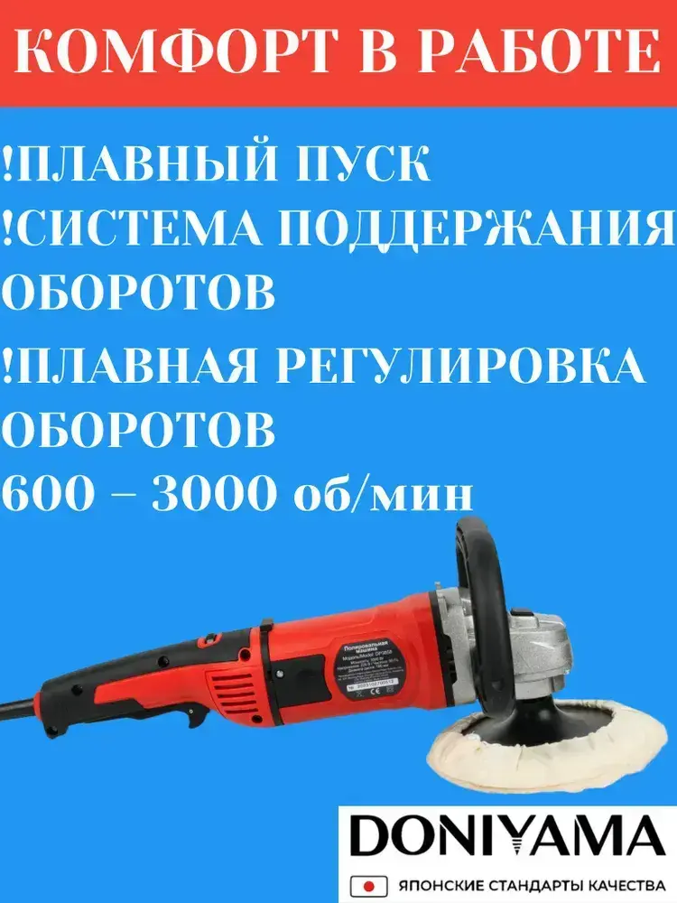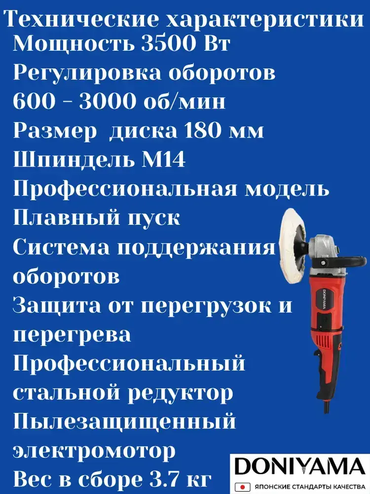Полировальная машина / полировальная машинка для автомобиля 180мм 3500Вт с ПЫЛЕЗАЩИЩЁННЫМ МОТОРОМ, плавным пуском и регулировкой скорости.