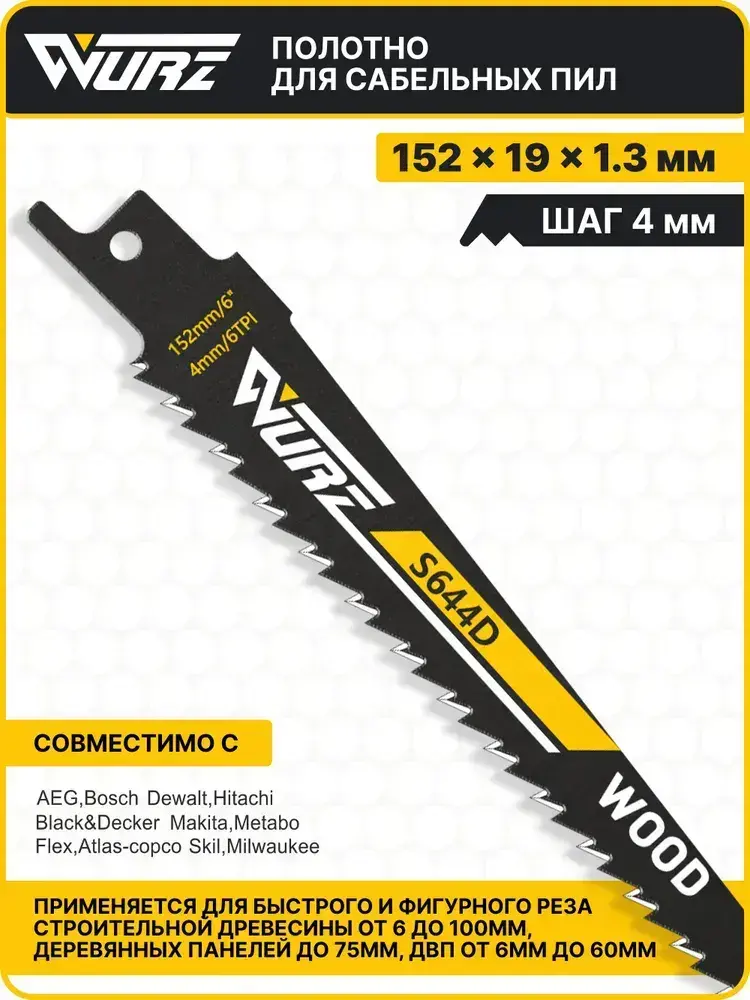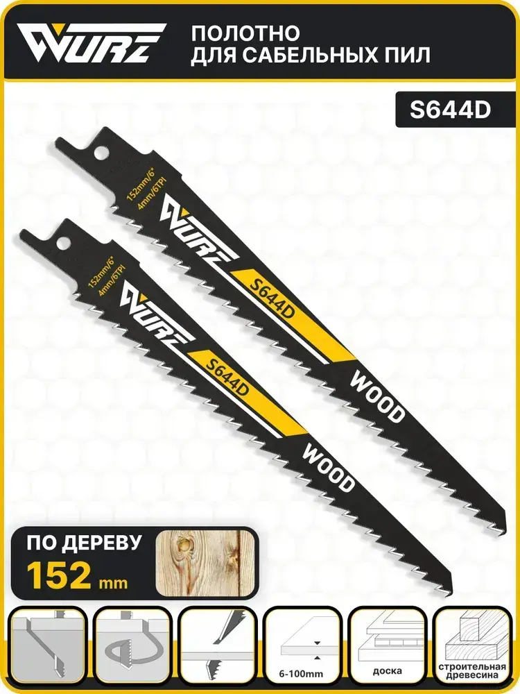 Полотно по дереву S644D (2шт.) для сабельной пилы 152мм/8" 4мм/6TPI Wurz
