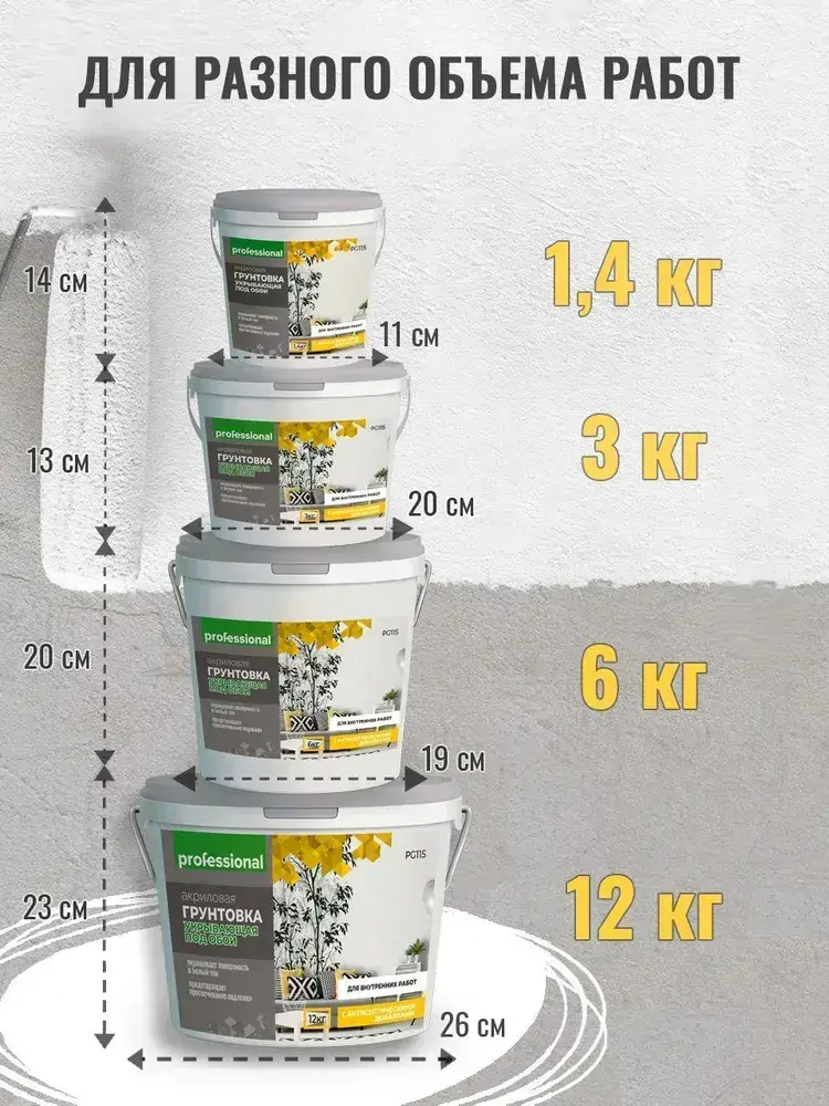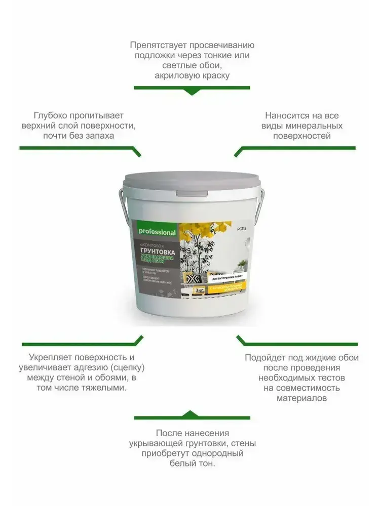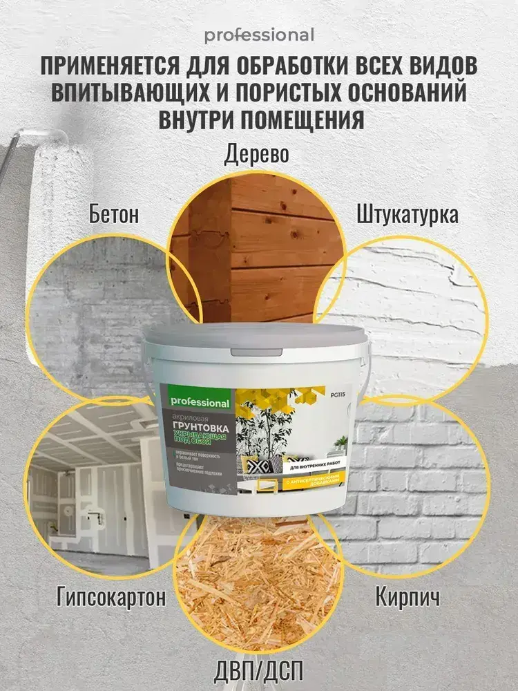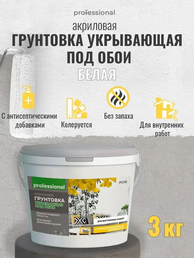 PROFESSIONAL Грунтовка для стен под обои акриловая пигментированная укрывающая белая с антисептиком без запаха для внутренних работ 3кг