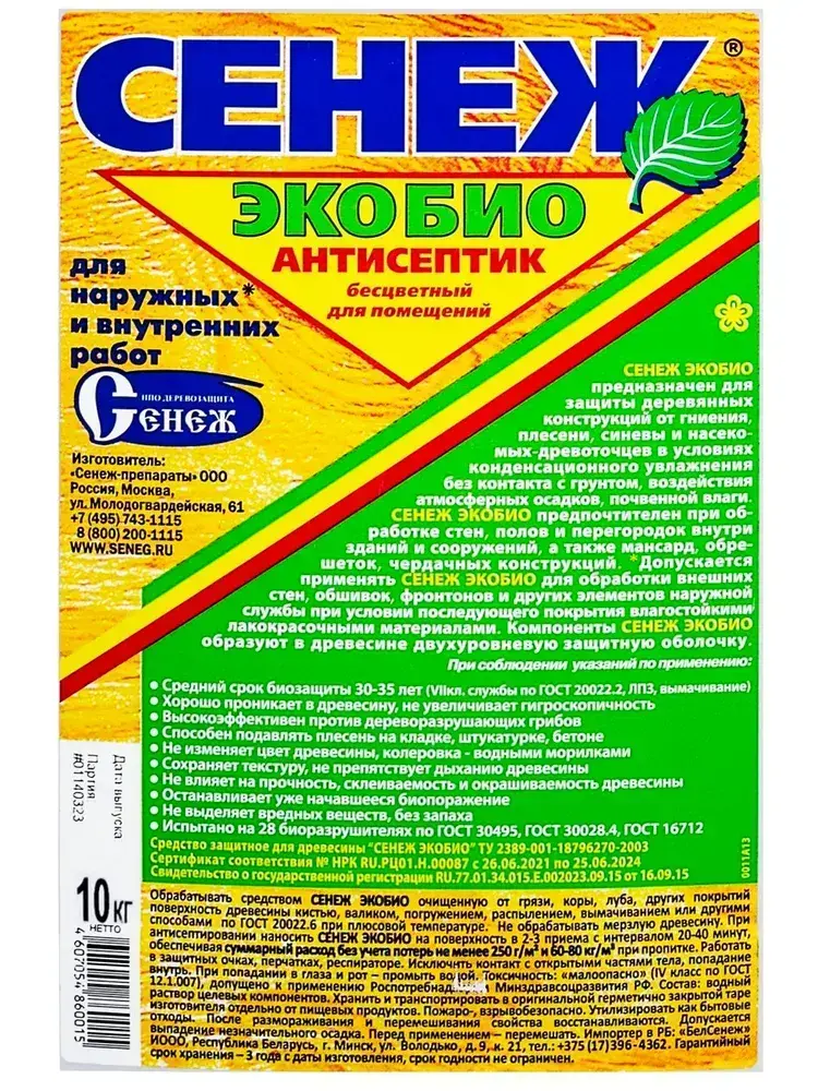 Пропитка Сенеж Экобио бесцветный антисептик для дерева 10 кг Экономичный бесцветный антисептик для помещений и деревянных конструкций под навесом