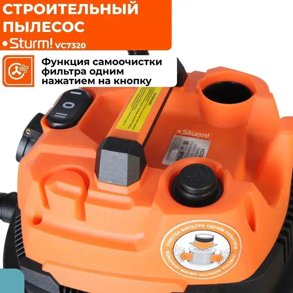 Пылесос строительный 1700Вт, объем бака 20л, поток воздуха 40 л/с, функции Сухая уборка/ Сбор жидкости/ Выдувсамоочистка, шланг 3м, синхронизация розетки 2кВт Sturm!