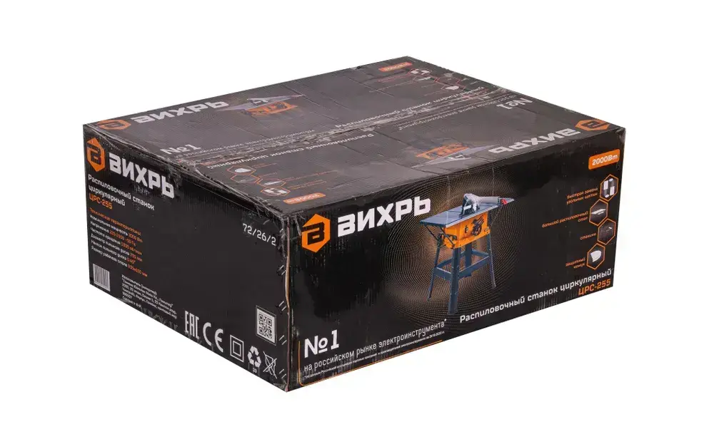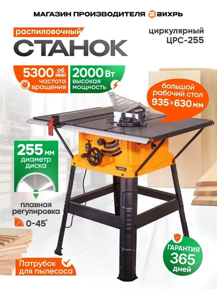 Распиловочный станок по дереву циркулярный ЦРС-255 Вихрь, для продольного и поперечного распиливания древесины, 2000 Вт