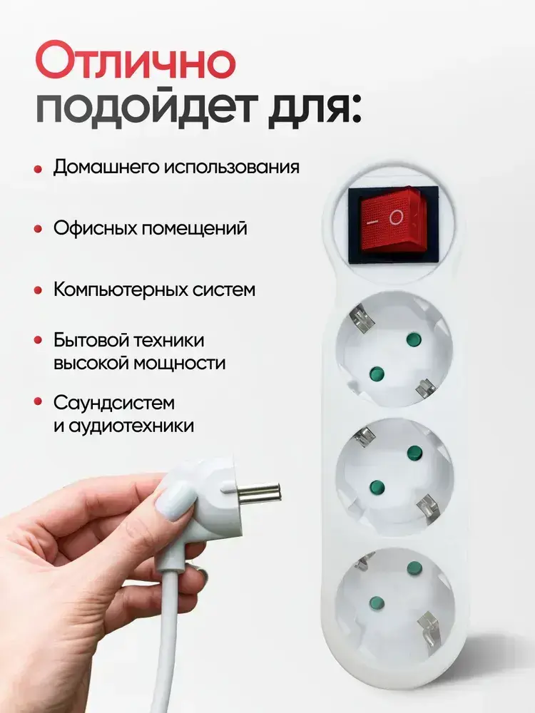Разветвитель для розетки, тройник с заземлением на 3 розетки