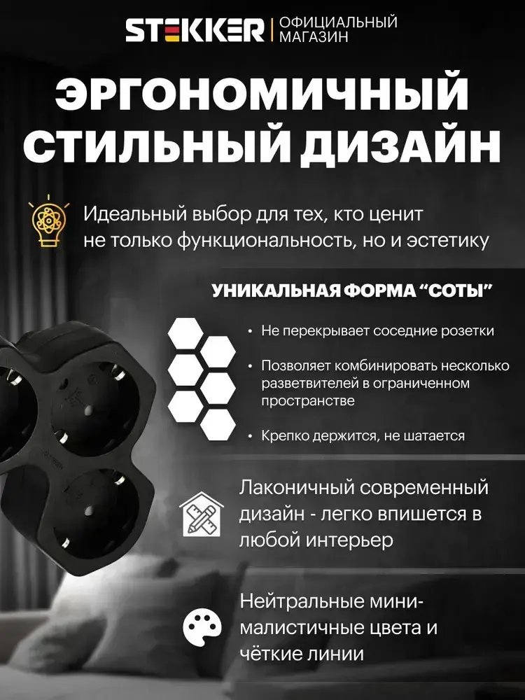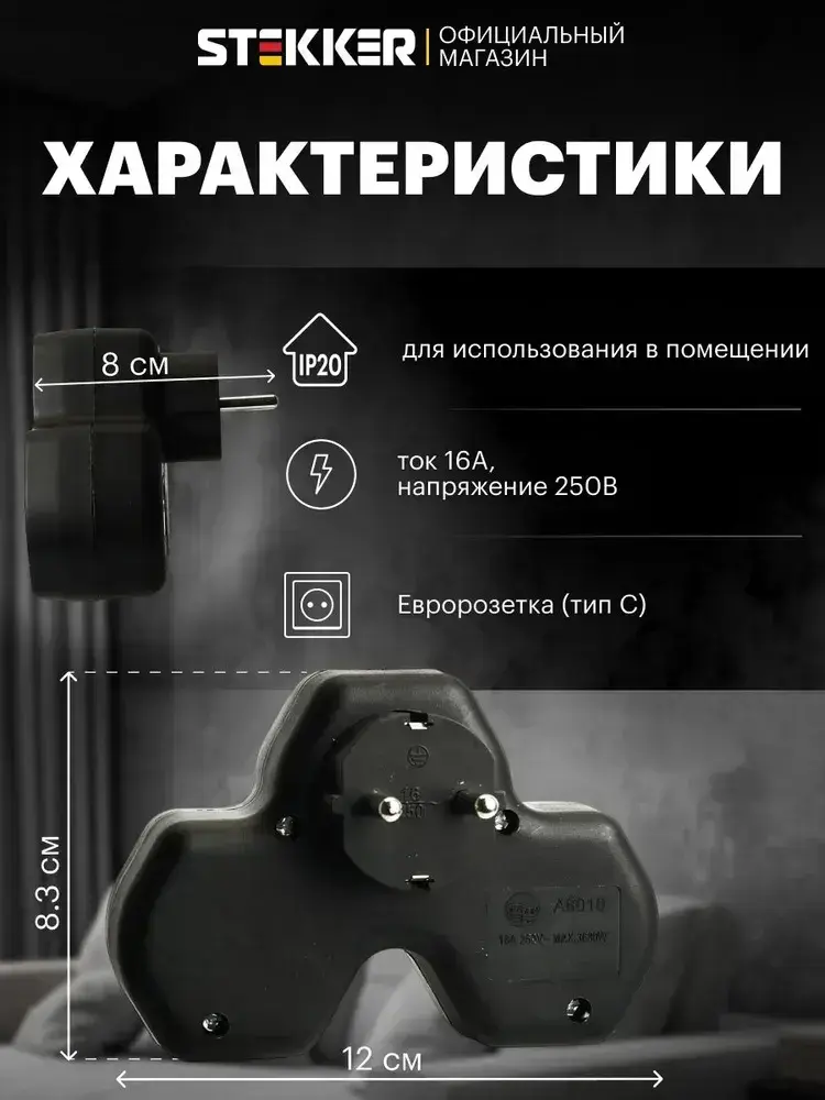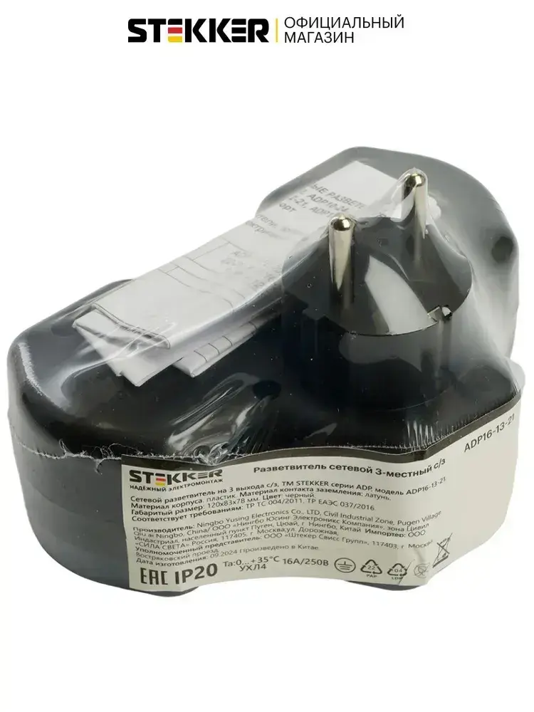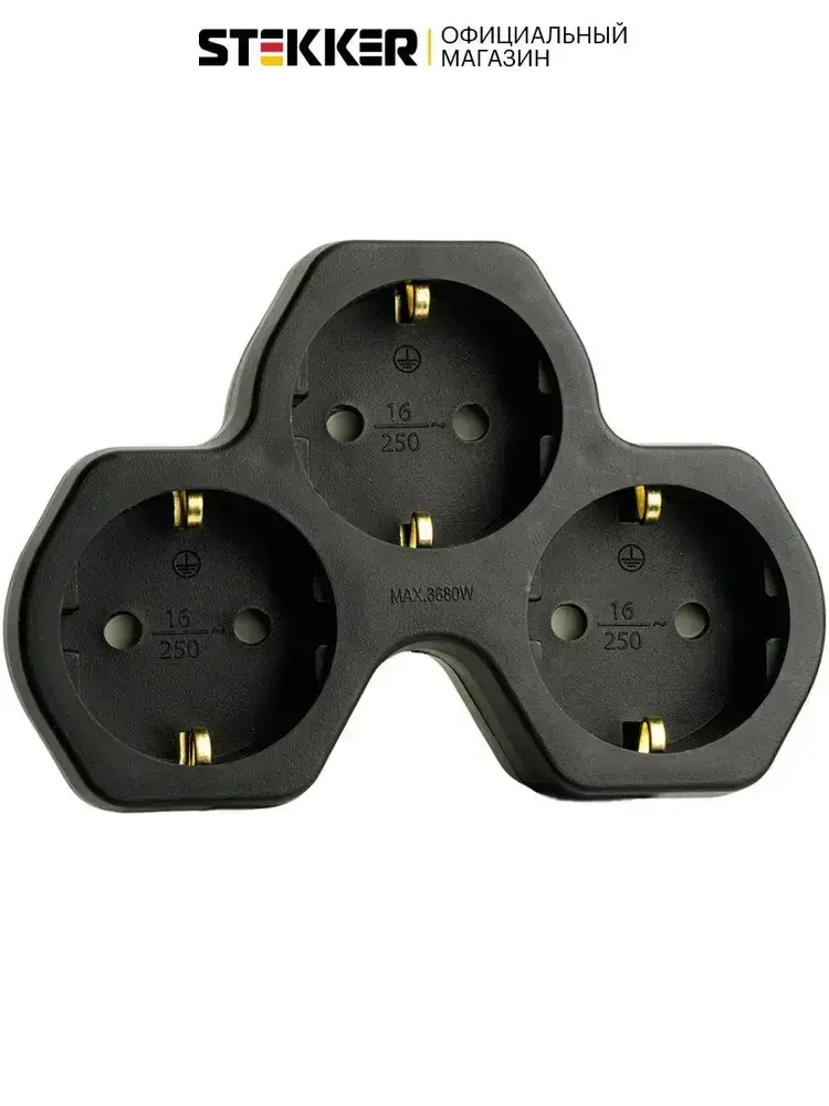 Разветвитель сетевой 3-местный с/з 250V,16A, ABS огнеустойчивый пластик, черный Stekker ADP16-13-21 50108