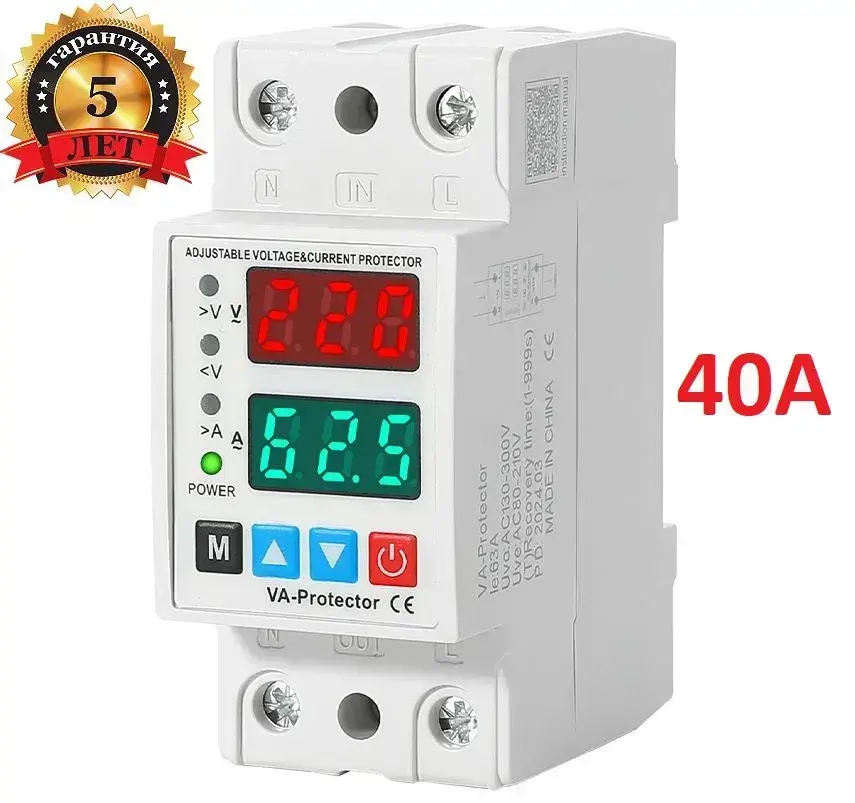 Реле контроля напряжения VA-Protector 220В, 40А (однофазное) с защитой перегрузки по току 40 А, контроль фаз на DIN (ДИН) рейку, модульное.