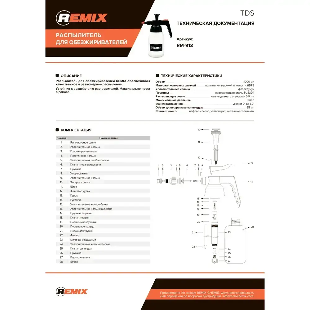 Remix распылитель помповый для обезжиривателя и моющих средств, 1 л