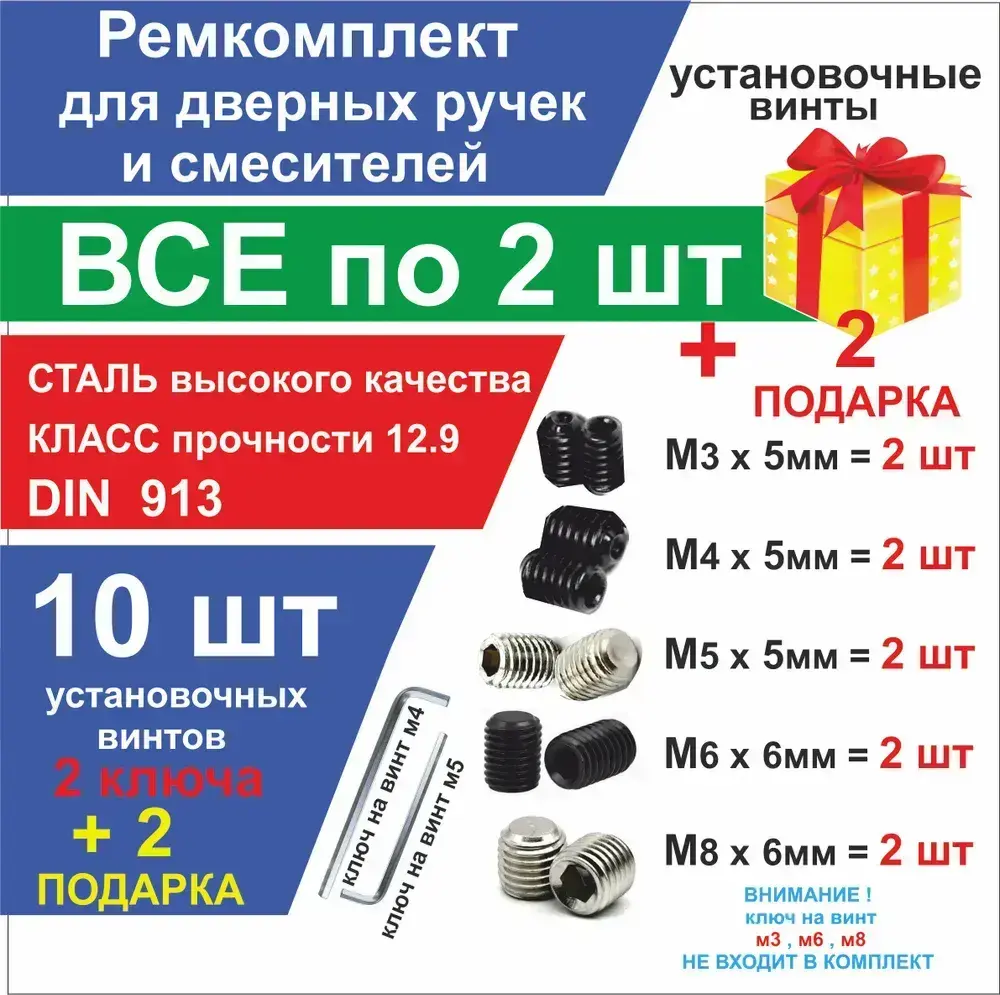 Ремкомплект набор стопорных винтов все по 2 шт. для дверных ручек ,смесителей, иглодержатель оверлока, рейлинг кухонный, наконечник карниза для штор, держатель полотенцесушителя, держатель проводов усилителя, бридж гитары, для планки вивера, для целика.
