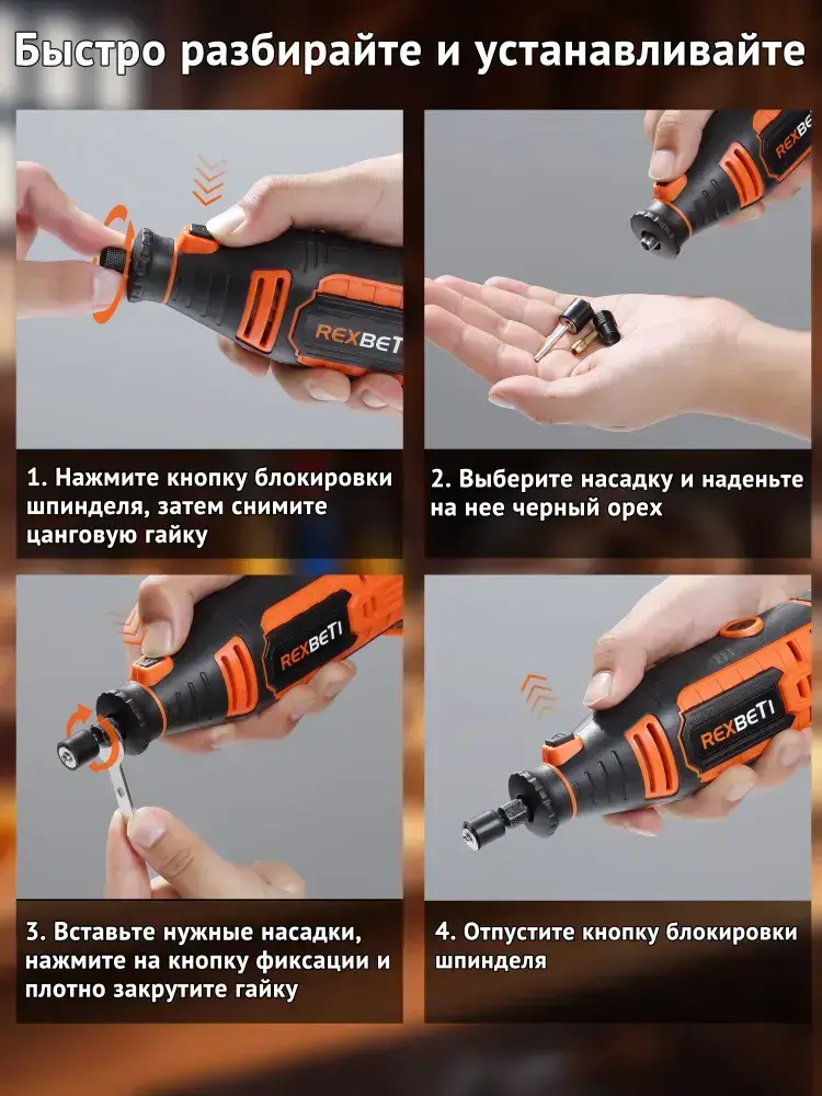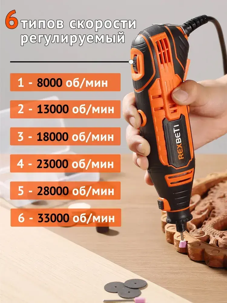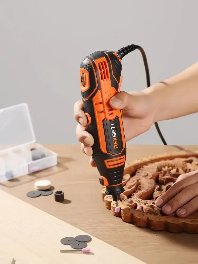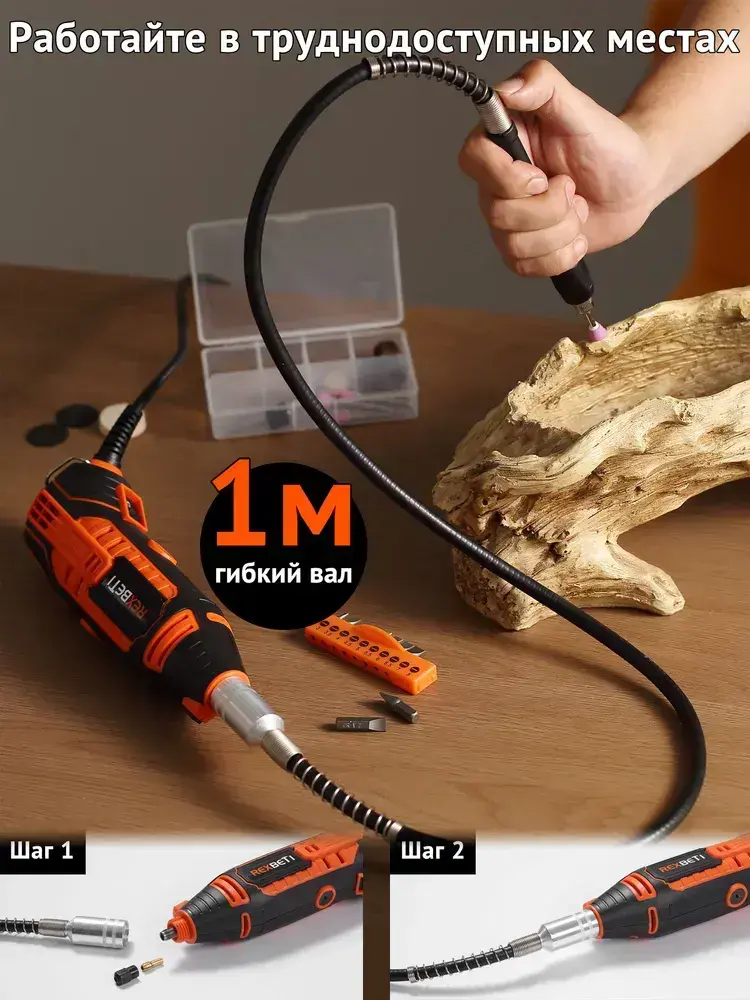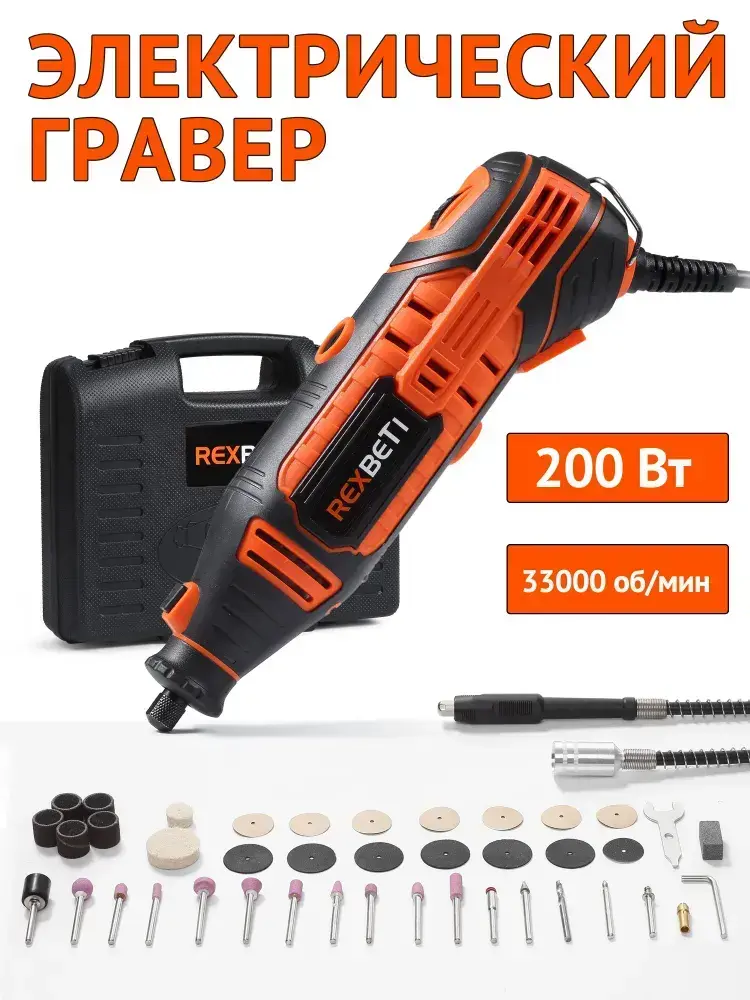 REXBETI Электрический гравер, Электрогравер с гибким валом для шлифовки( 200 Вт, 33000 об/мин, 40 шт насадок, регулировка скорости, Защитная коробка)
