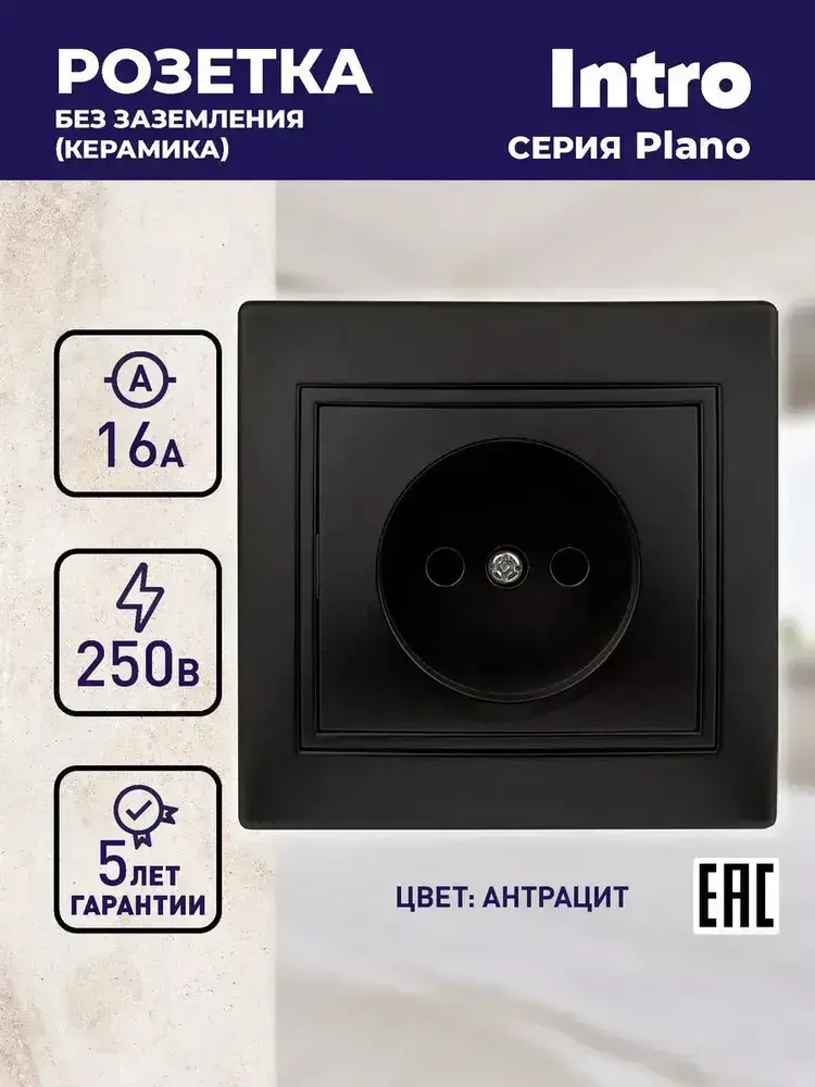 Розетка Intro Plano 1-201-05 без заземления 2P 16А-250В IP20 скрытой установки черный