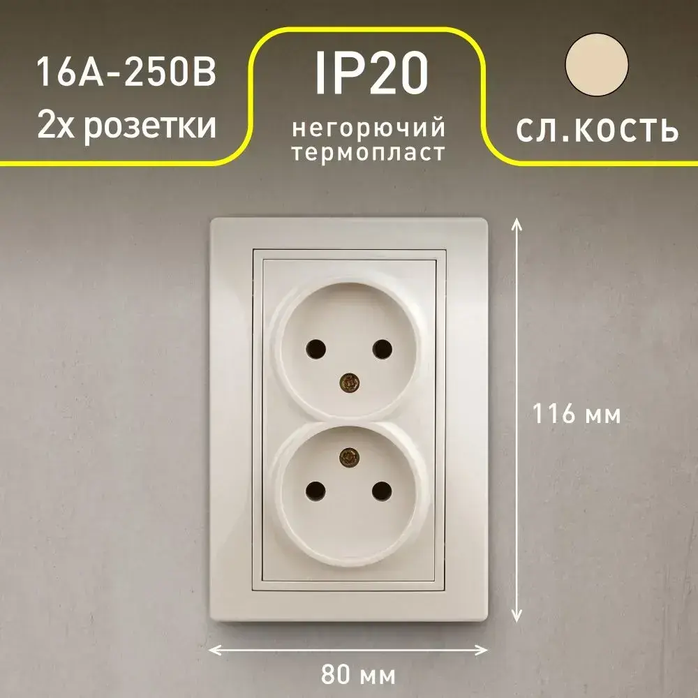 Розетка Intro Plano 1-204-02 без заземления двойная 2х2P 16А-250В IP20 скрытой установки Plano слоновая кость