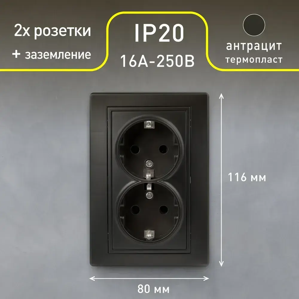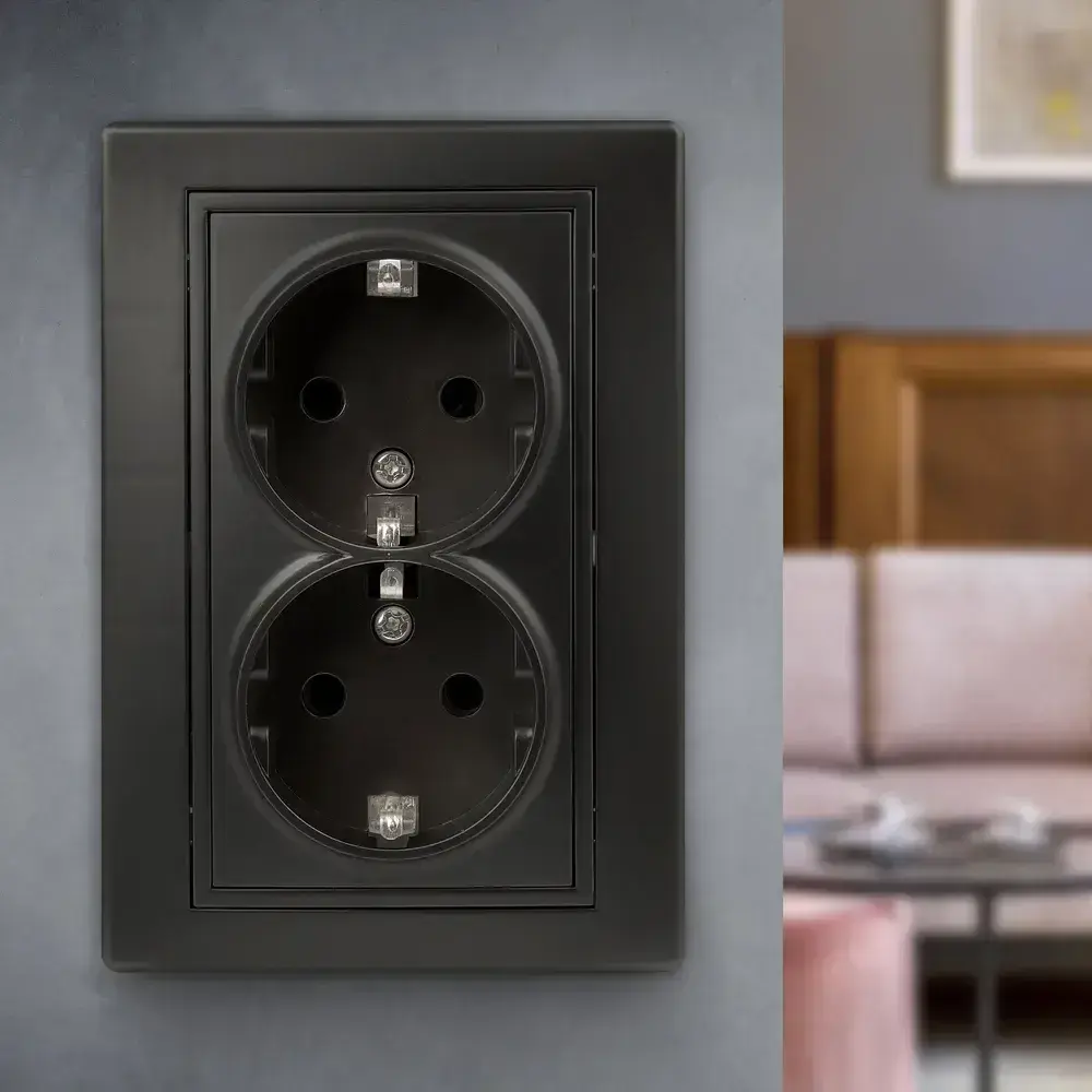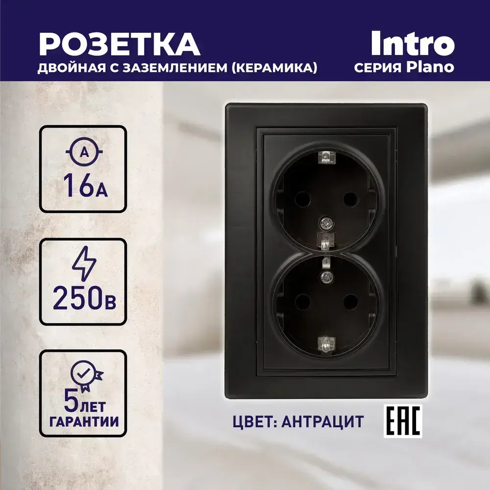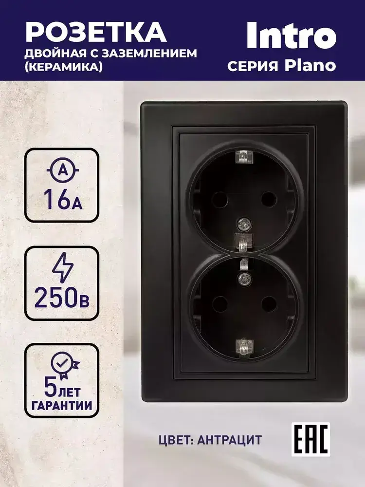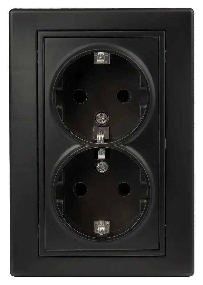 Розетка Intro Plano 1-205-05 с заземлением двойная 2X2P+E Schuko 16А-250В IP20 скрытой установки черный