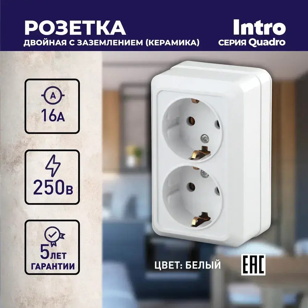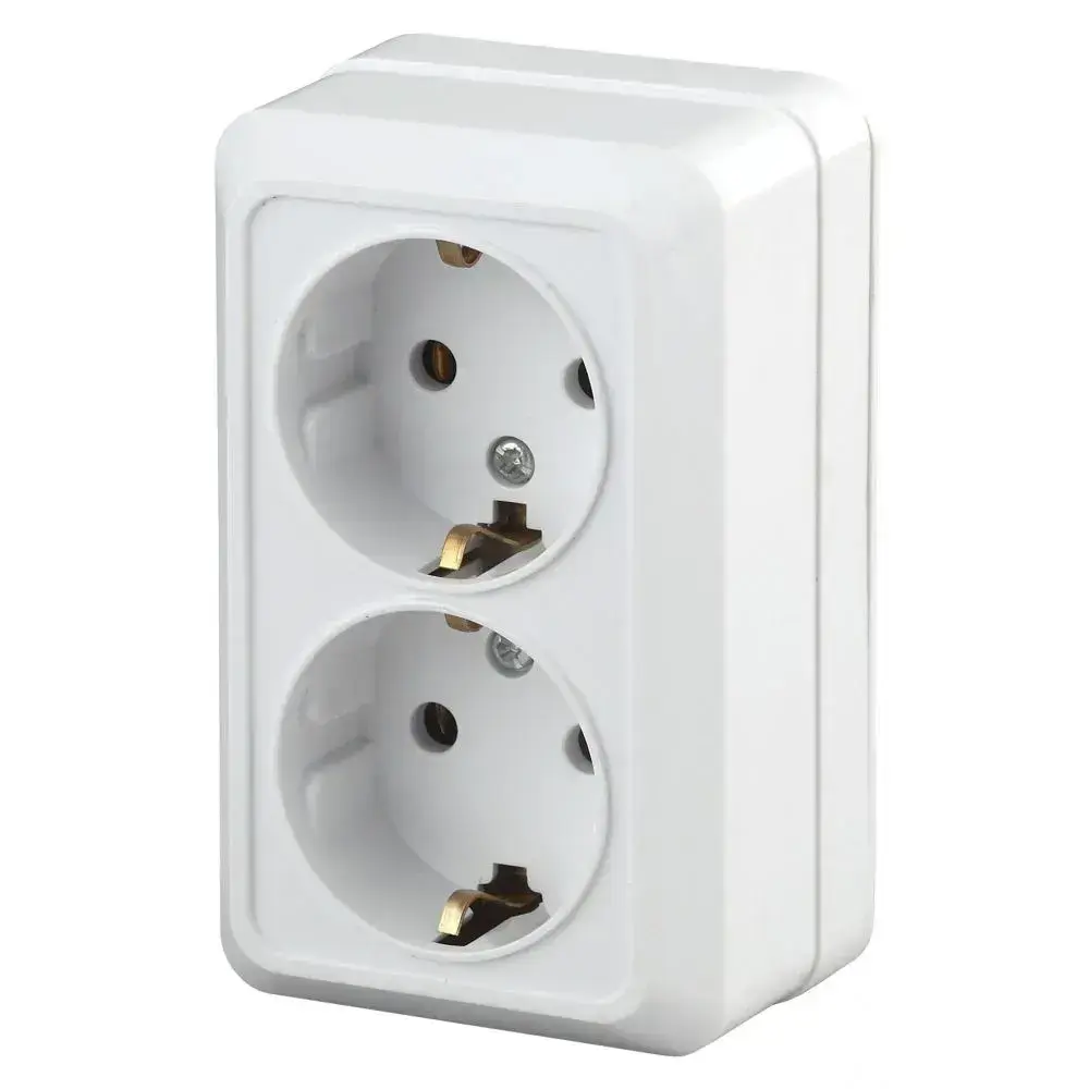 Розетка Intro Quadro 2-204-01 с заземлением двойная 2х2P+E Schuko 16А-250В IP20 открытой установки белая