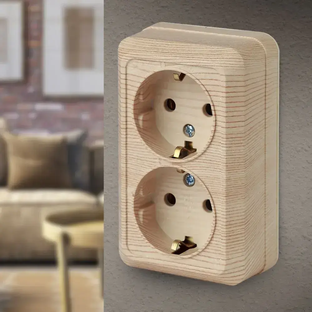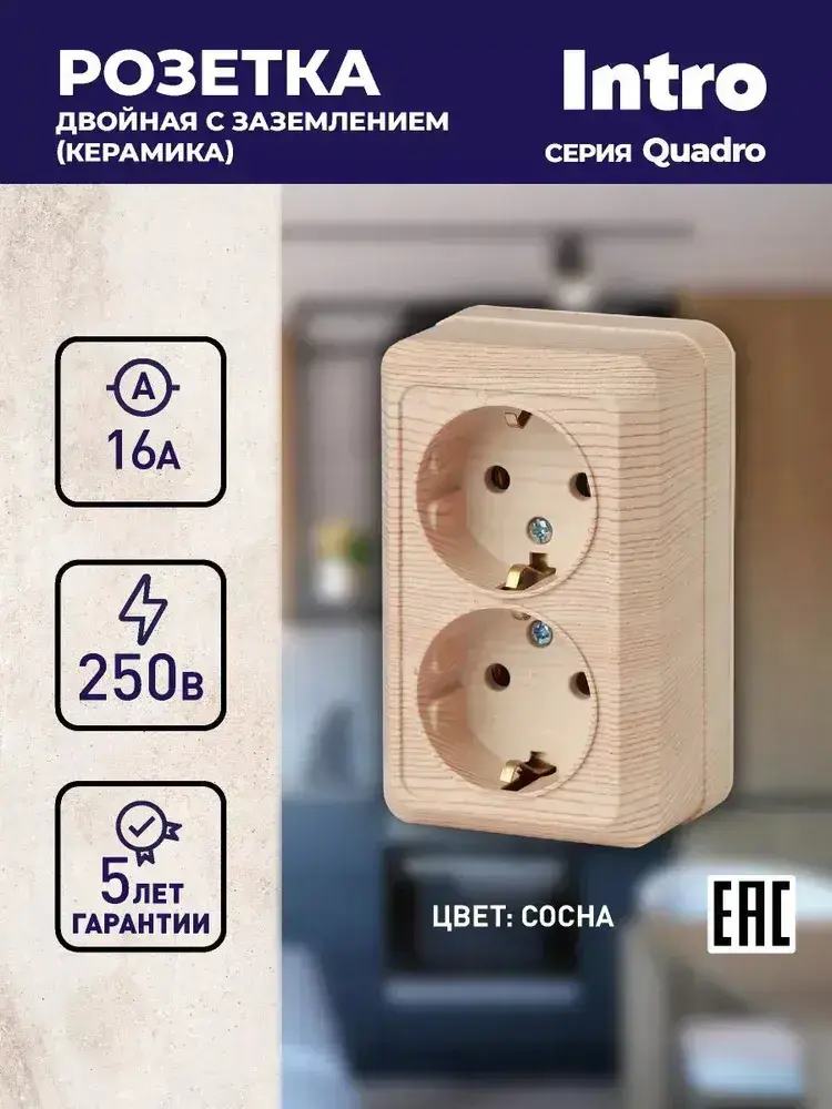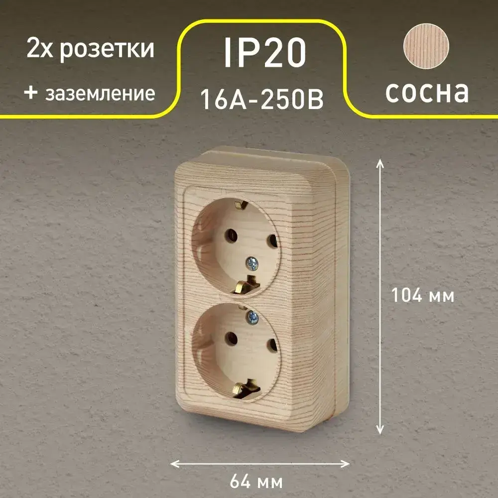 Розетка Intro Quadro 2-204-11 с заземлением двойная 2х2P+E Schuko 16А-250В IP20 открытой установки сосна