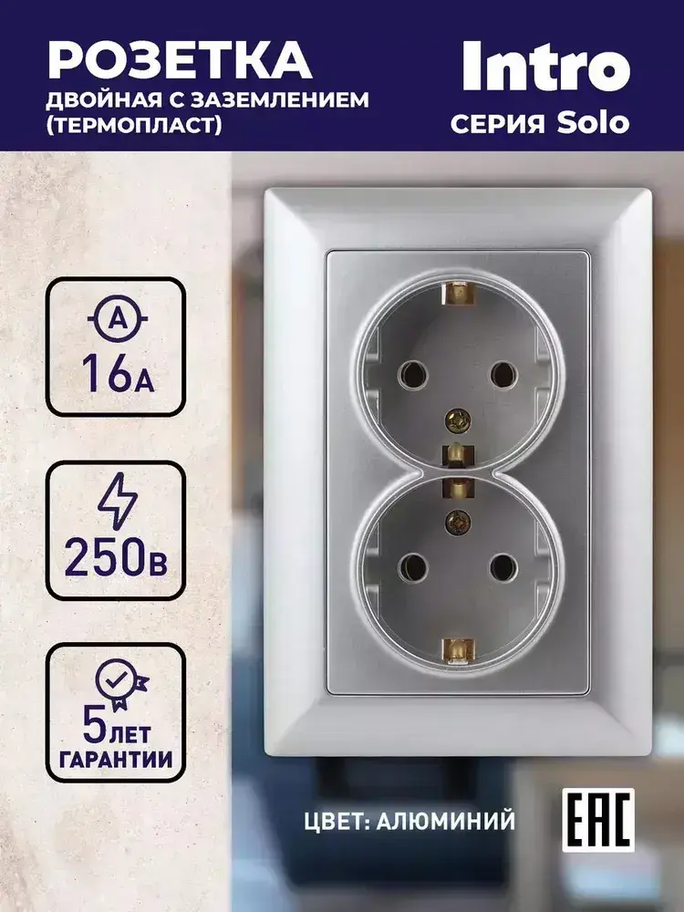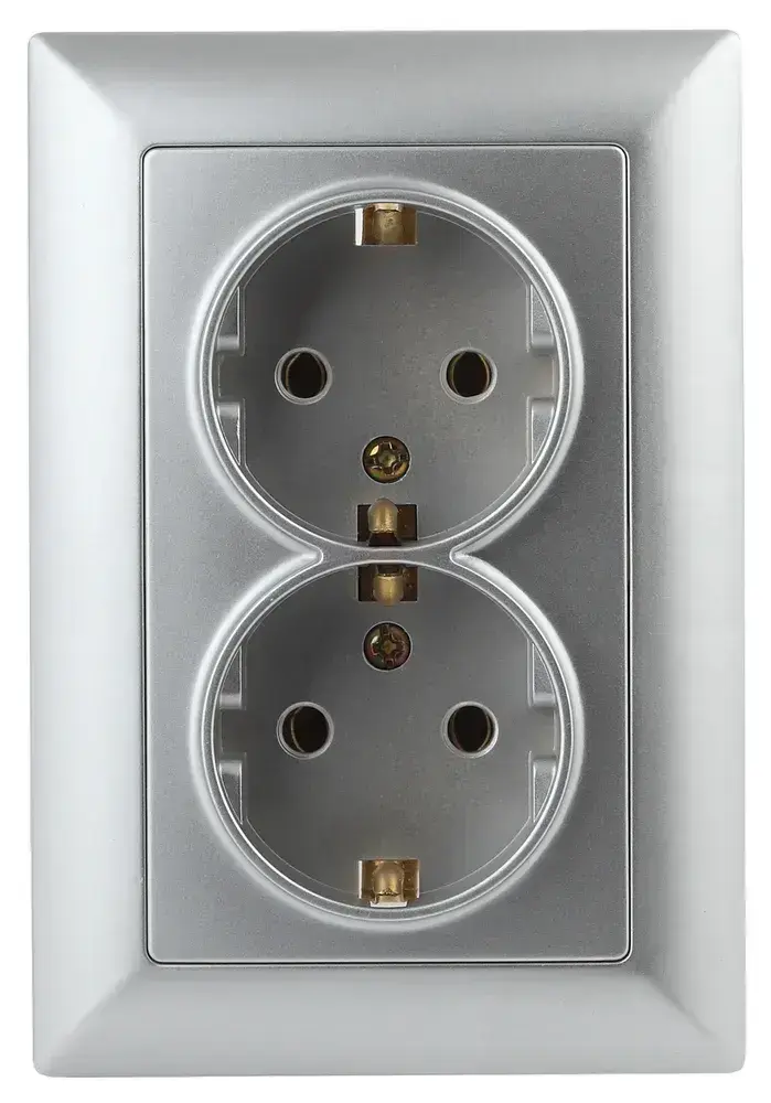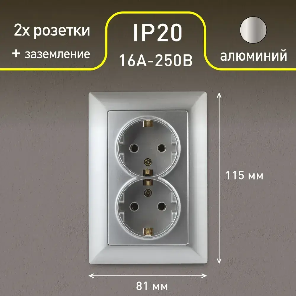 Розетка Intro Solo 4-205-03 с заземлением двойная 2X2P+E Schuko 16А-250В IP20 скрытой установки алюминий