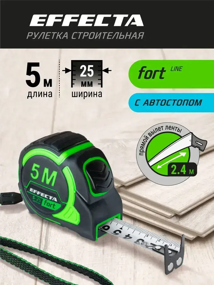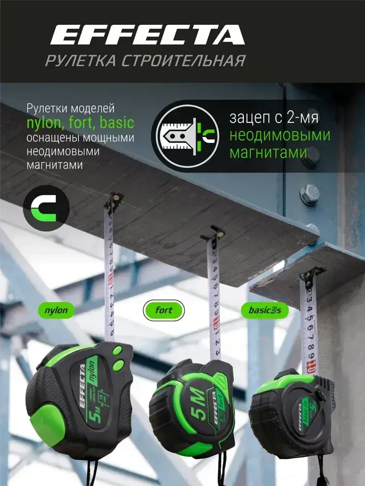 Рулетка Effecta Fort 5м/25 мм, магнит, автостоп, лента -2стор шкала- нейлон