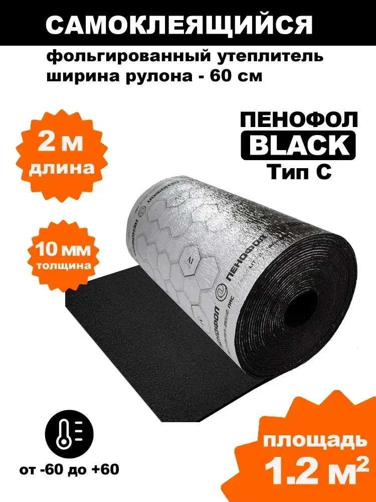 Самоклеящийся фольгированный утеплитель Пенофол Black черный 10мм, 2 метра