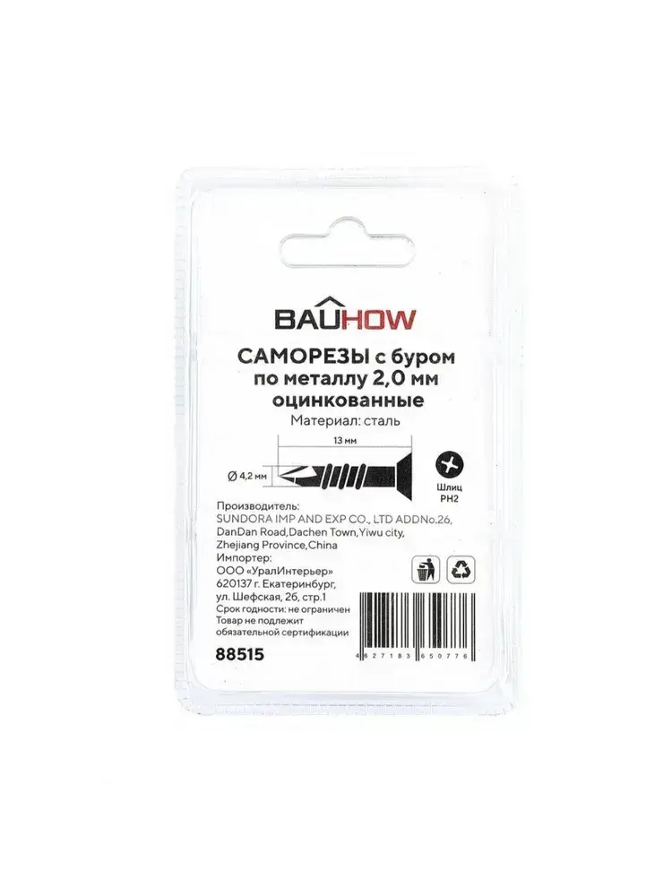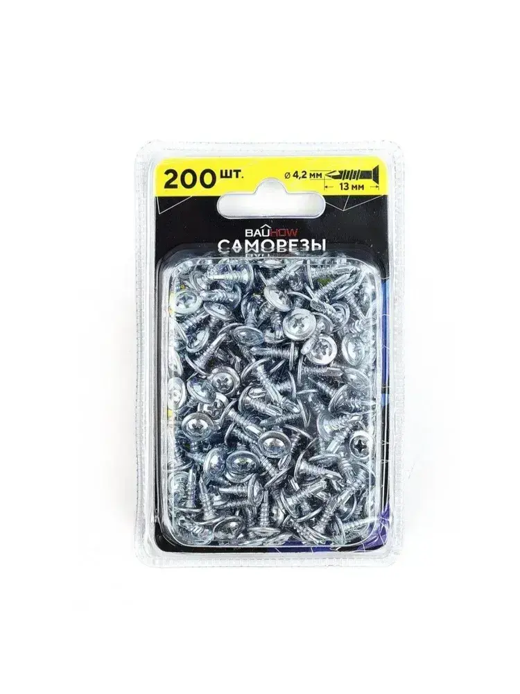 Саморез 4,2x13 по металлу 2,0 мм с буром BAUHOW, оцинкованный 200шт в блистере