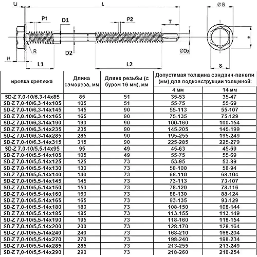 Саморез для сэндвич-панелей 6,3 / 5,5 х 185 (100 штук)