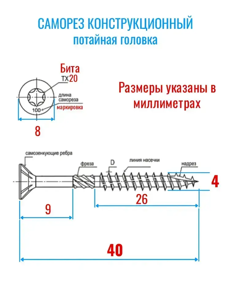 Саморез конструкционный по дереву 4 х 40 потай Torx 20 (150шт)