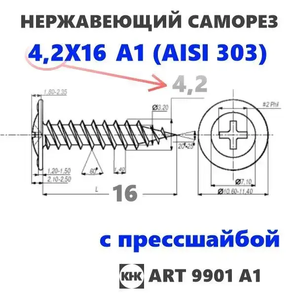 Саморез нержавеющий 4,2х16 с прессшайбой остроконечный КНК, нерж сталь, клоп Li, 100 шт.