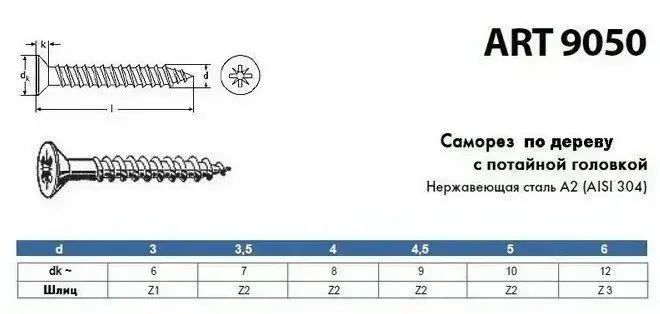Саморез нержавеющий А2 АРТ 9050 универсальный для дерева и ДСП с потайной головкой под крест, размер 3х50, 10 шт