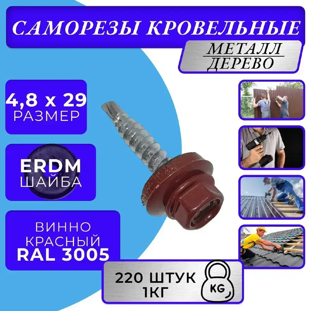 Саморезы кровельные по дереву 4.8х29 RAL 3005 (Винно-красный) 1кг