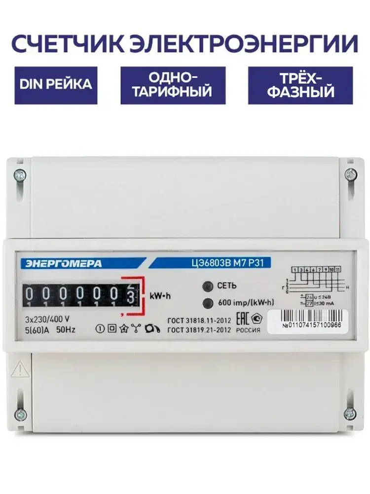Счетчик электрический трехфазный однотарифный ЦЭ6803В М7 Р31 5-60А 380В DIN-рейка