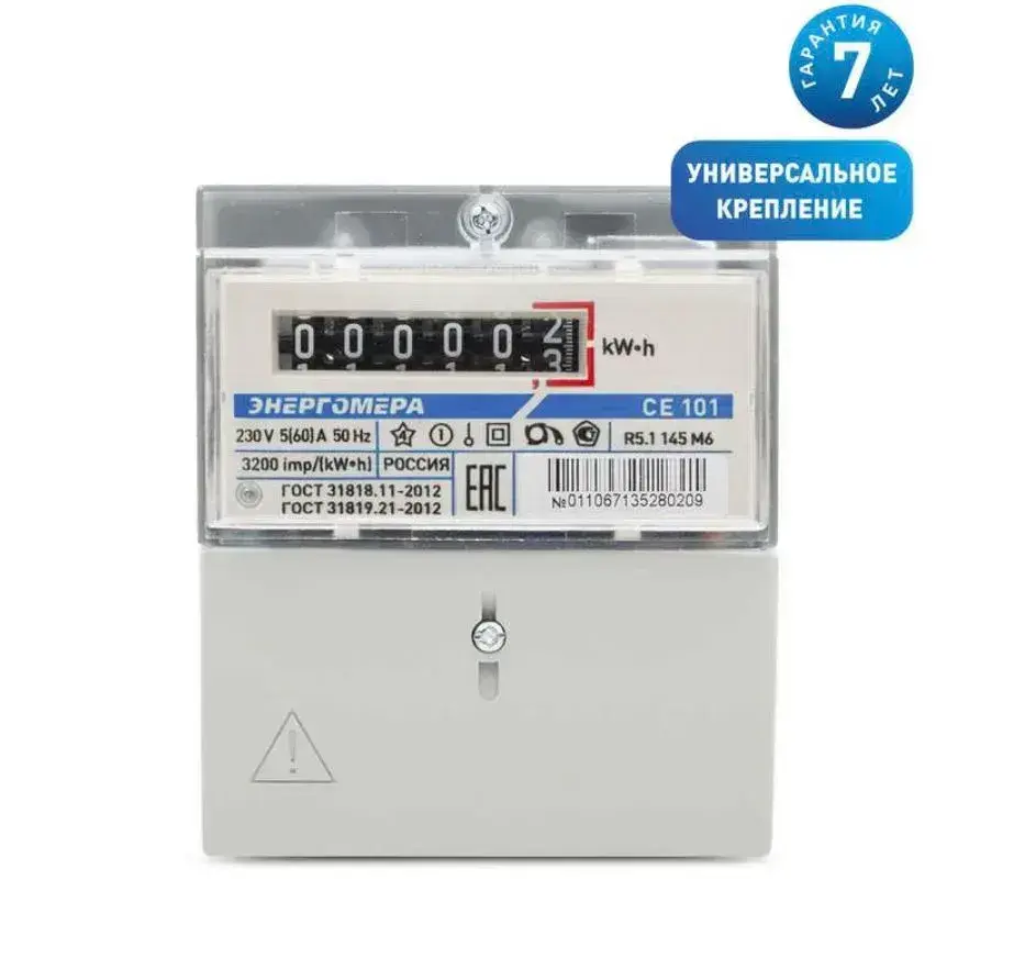 Счетчик электроэнергии однофазный однотарифный CE101 R5.1 145 M6 , 5(60), кл.точ. 1.0 Энергомера 2025