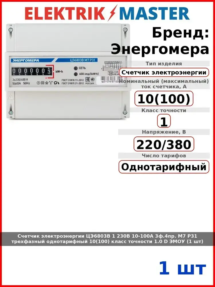 Счетчик электроэнергии ЦЭ6803В 1 230В 10-100А 3ф.4пр. М7 Р31 трехфазный однотарифный 10(100) класс точности 1.0 D ЭМОУ (1 шт)